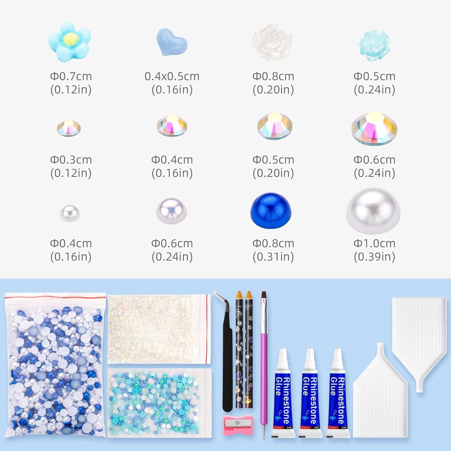 - What You Will Receive: 60g(30g*2)mixed size flat back pearls and rhinestones. 3*Rhinestone Glue. 1* wax pencil for rhinestones. 1*Pencil sharpener(color random). The mix half round pearls and rhinestones can make more beautiful handicrafts for your friends, parents, yourselfs on any festivals.If you need a mixed size pack of pearl rhinestones