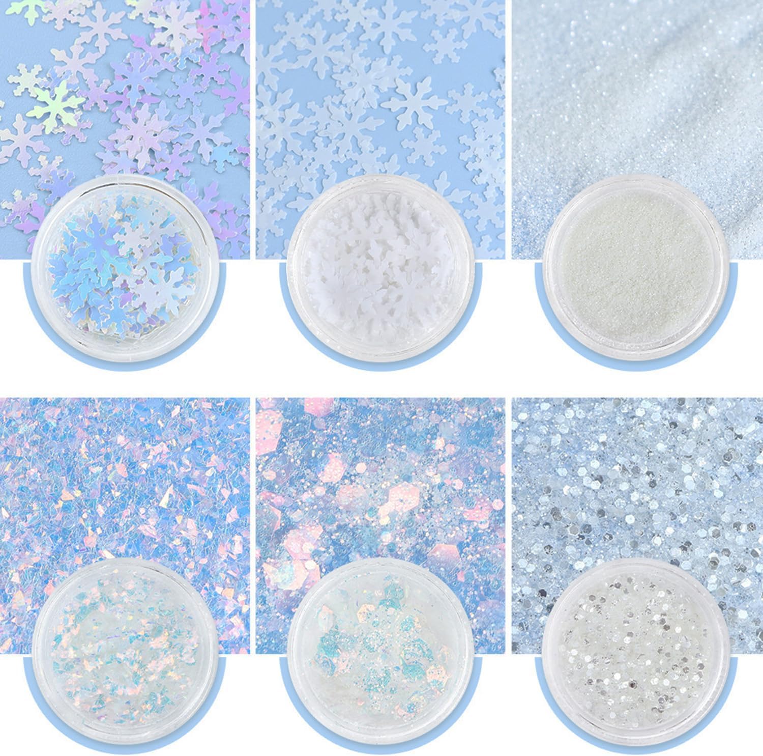 - 【Snowflake Glitter】-- You will get 1 grids white manicure fine glitter powder and 5 grids blue white glitter nail art sequins (snowflake, hexagon, round), A variety of style for you to choose DIY to decorate your nails in winter.