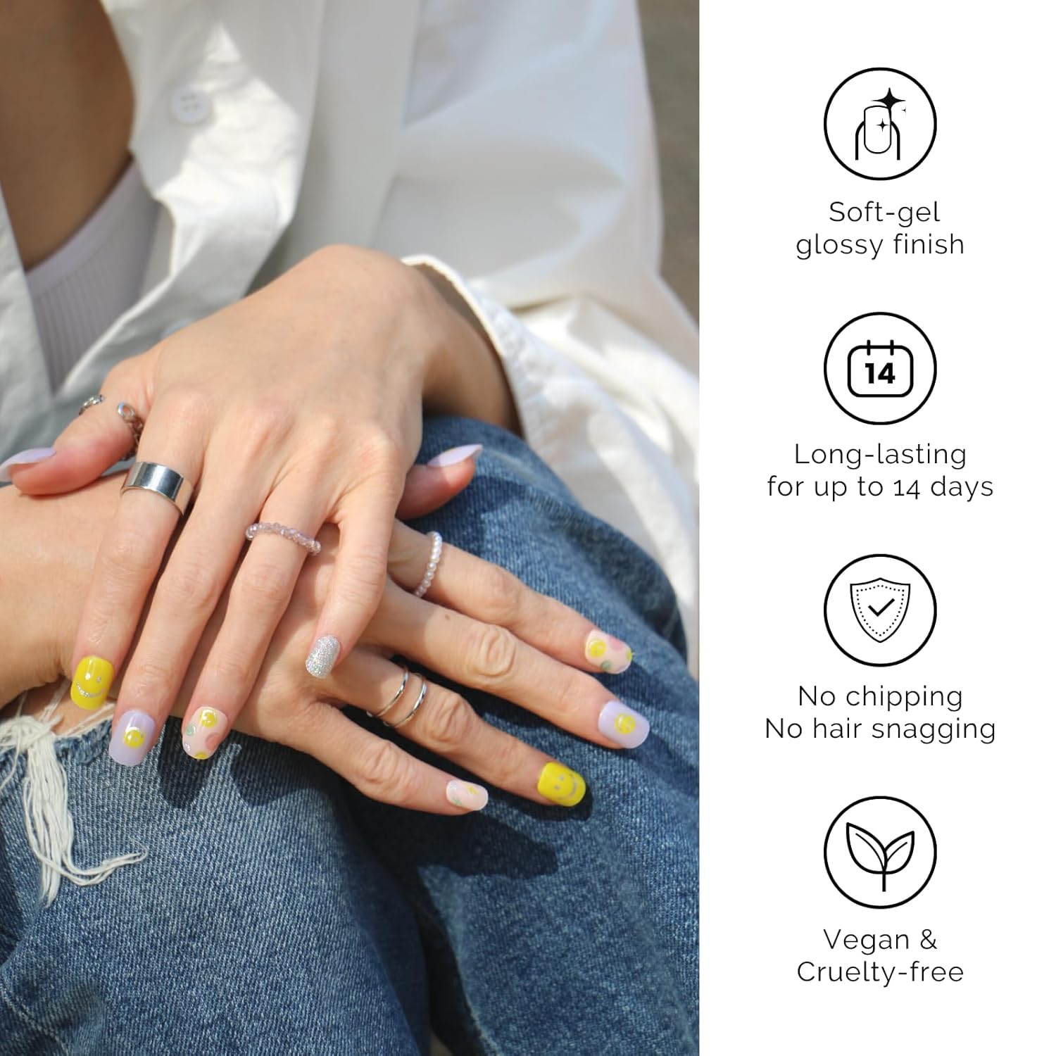 - ăSALON QULITYă Made of real nail polish 60% precured, soft to fit all nail shapes - Nailog semi-cured strips with waterproof top gel last up to 2 weeks once cured with a UV lamp. - Our gel nails are also extremely lightweight so they do feel like your own nails!