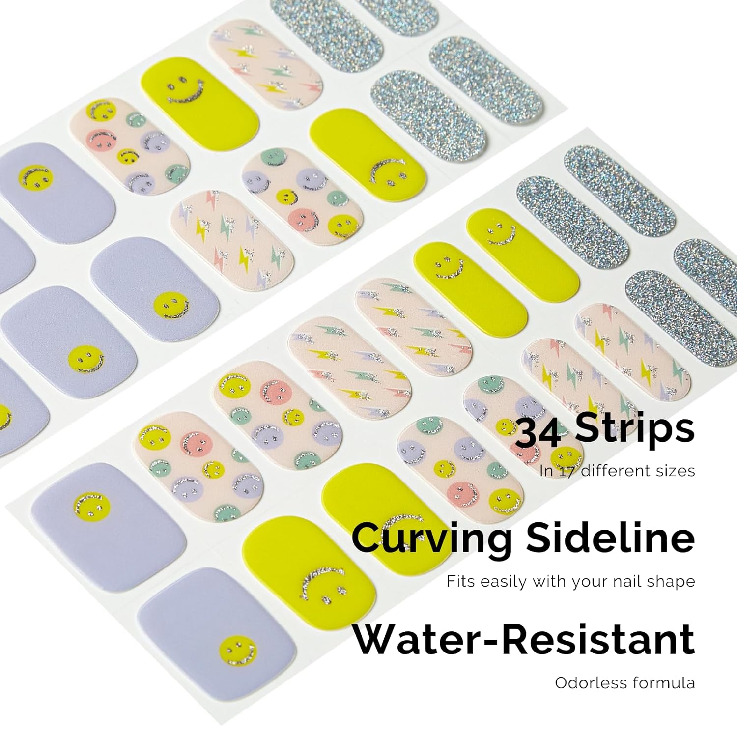 - ă34 PCS NAIL STRIPSăMore Quantity & Sizes than Ever! - With 17 different sizes of our nail art stickers, you can easily find the right size to match your nails. - New curved side line fits even better with your nail shape for seamless adhesion.