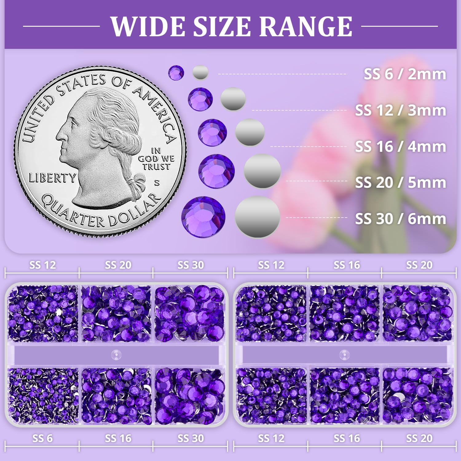 - 💎PACKAGE CONTENT -- This resin rhinestone package includes 2 boxes with 6 grids, featuring a variety of sizes: Box #1 contains 2mm x 1 grid, 3mm x 1 grid, 4mm x 1 grids, 5mm x 1 grids, and 6mm x 2 grids; Box #2 contains 3mm x 2 grids, 4mm x 2 grids, 5mm x 2 grids. 1 tweezers and 1 pickup pen are included for easily picking up of rhinestones. This set offers more large-sized gems, making it perfect for DIY craft decorations, eye makeup, face makeup and nail art.