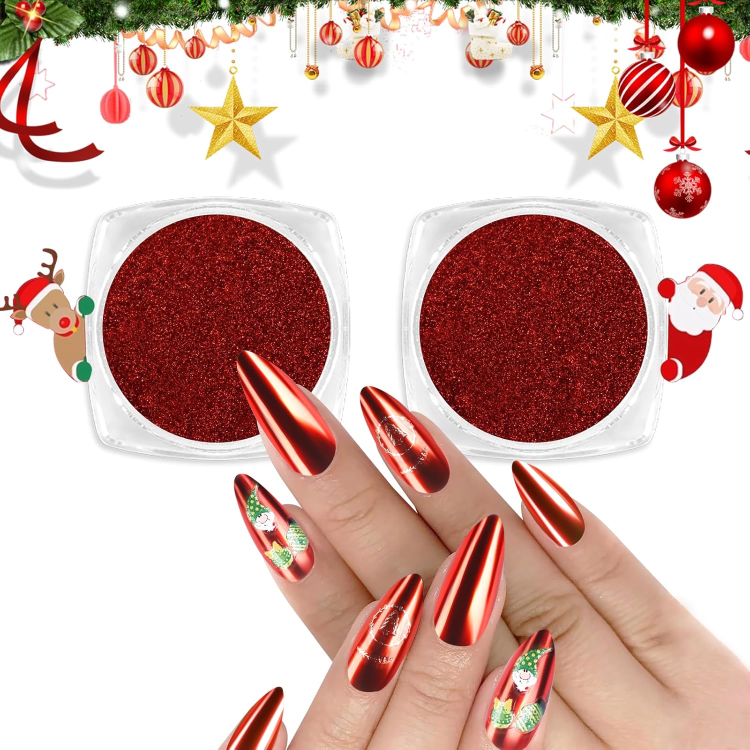 Allstarry Red Chrome Nail Powder, 2pcs Metallic Mirror Effect Dust Glitter Glazed Manicure Decoration Reflective Pigment for Gel Polish Valentines Nails Christmas Decoration- Red
