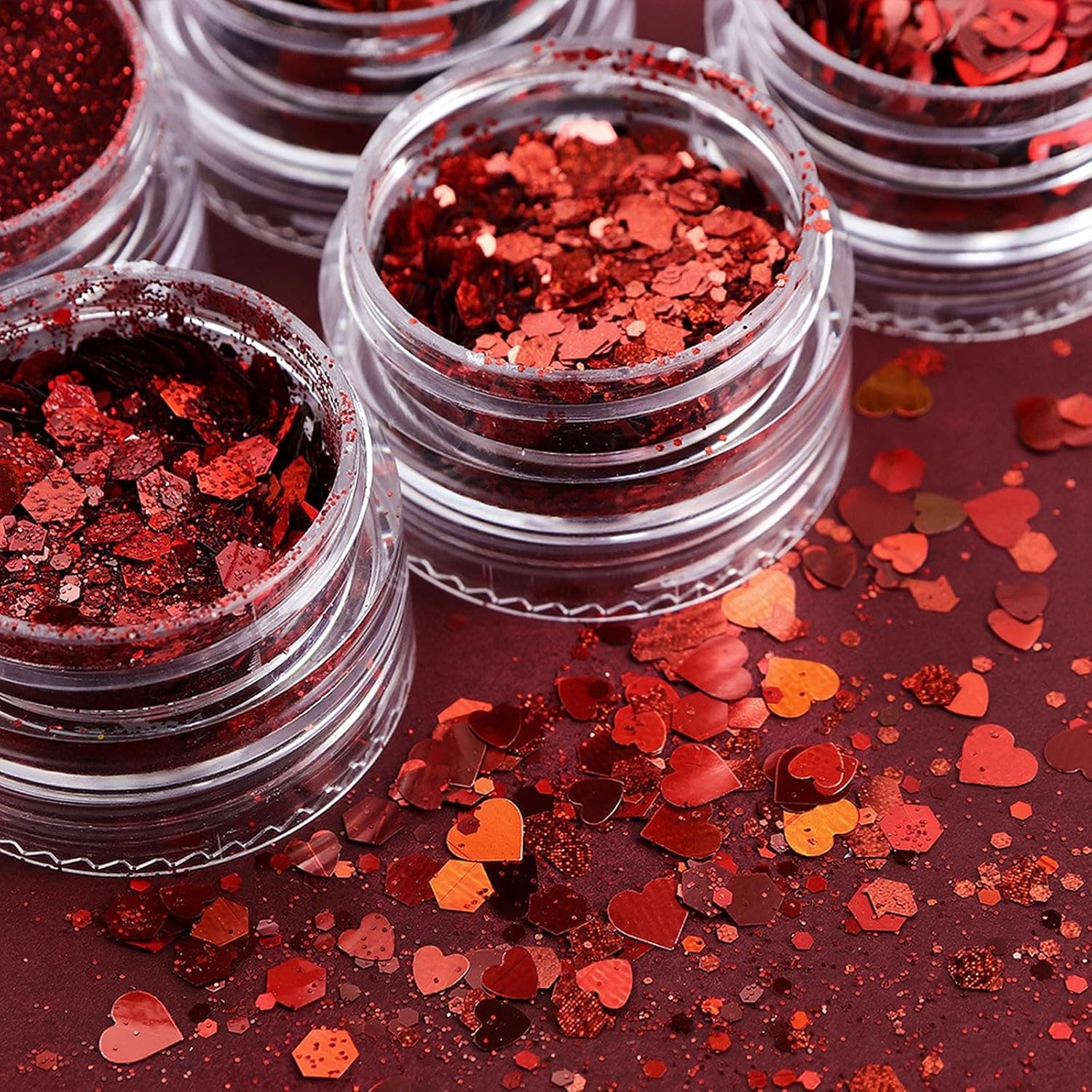 - 【Heart Glitter】-- You will get 1 grids red manicure fine glitter powder and 5 grids red glitter nail art sequins (heart, hexagon), A variety of style for you to choose DIY to decorate your nails on Valentines Day and sweet day.
