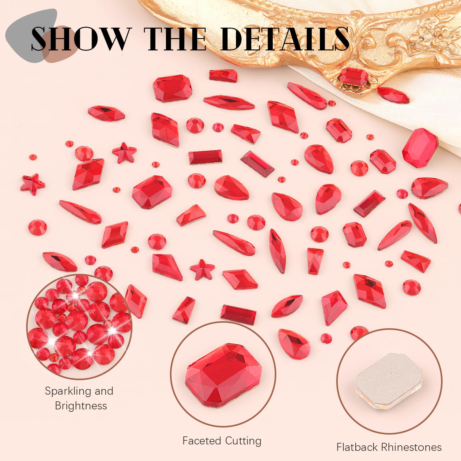 - 💎PACKAGE CONTENT -- The package contains 120Pcs multi shapes flatback gems crystal and 3100Pcs 1.5-4mm round beads, totally 3220Pcs Red rhinestones. Additionally, 1 tweezers for large size gems and 1 pickup pen for small size gems. 1 15ml rhinestones glue gel for nail design. This rhinestones kit makes it easy for you to make any nail art you like, and will bedazzle your acrylic nails!