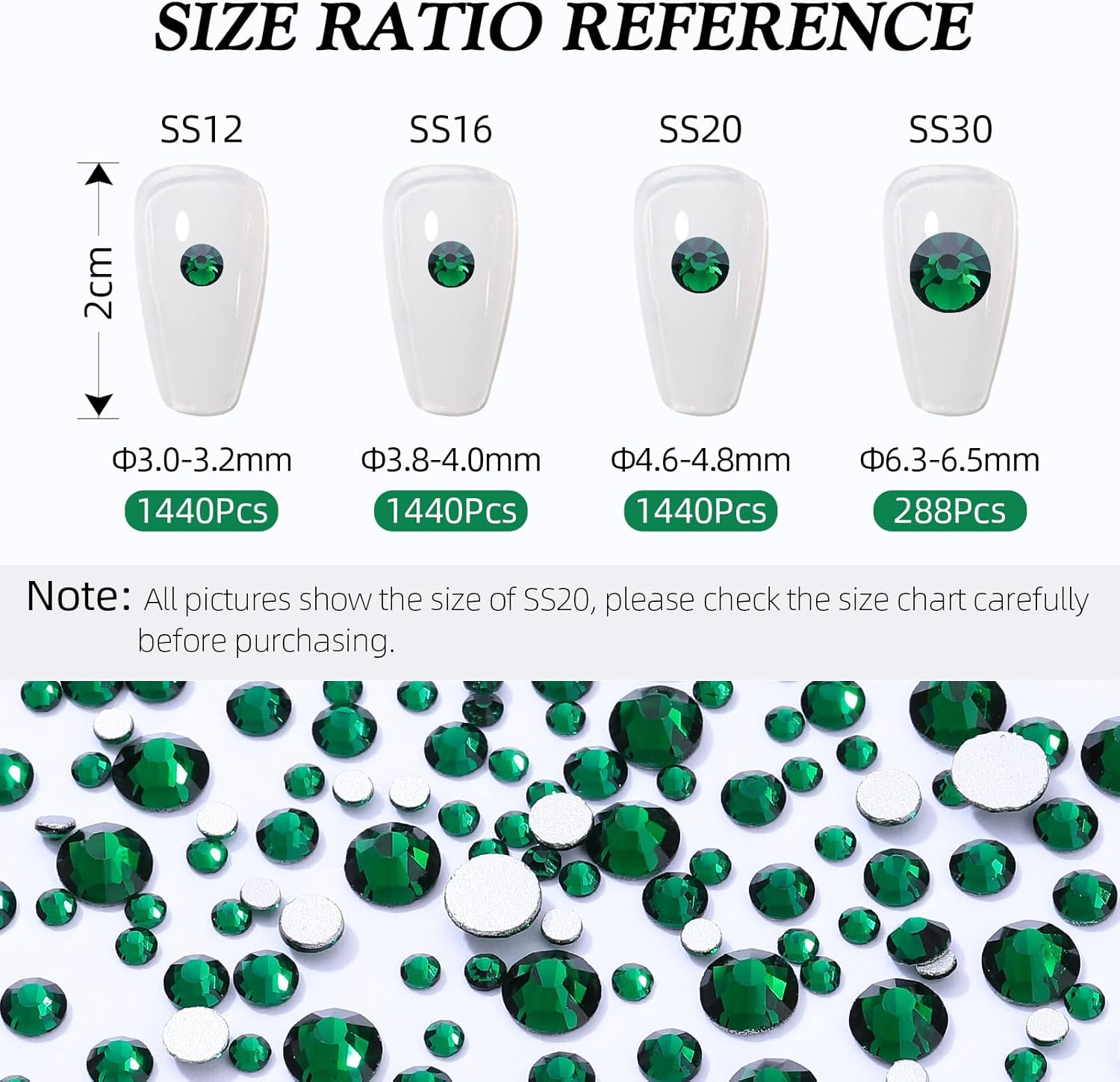 - Product Packaging: Bags packaging SS20 4.6~4.8 MM - 2880 Pcs malachite green flatback rhinestones.