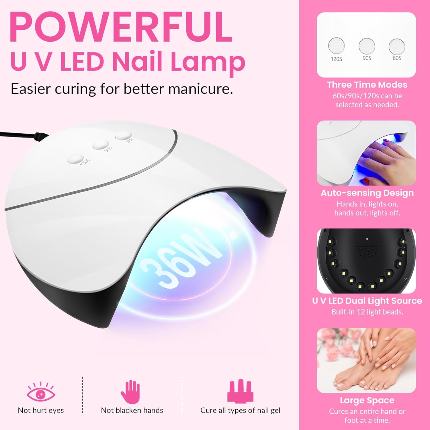 - ăEssential Nail Lamp for Cureă Professional nail light in this gel nail polish kit has three time options: 60s/90s/120s, and automatic sensor design, allowing you to easily control the curing of gel nail polish. U V/LED dual light source design, with 12 lamp beads, can efficiently cure almost all kinds of nail gels, not hurt your eyes, not black hands. Enough space to cure a whole hand or foot, bring you high quality nail art curing experience.