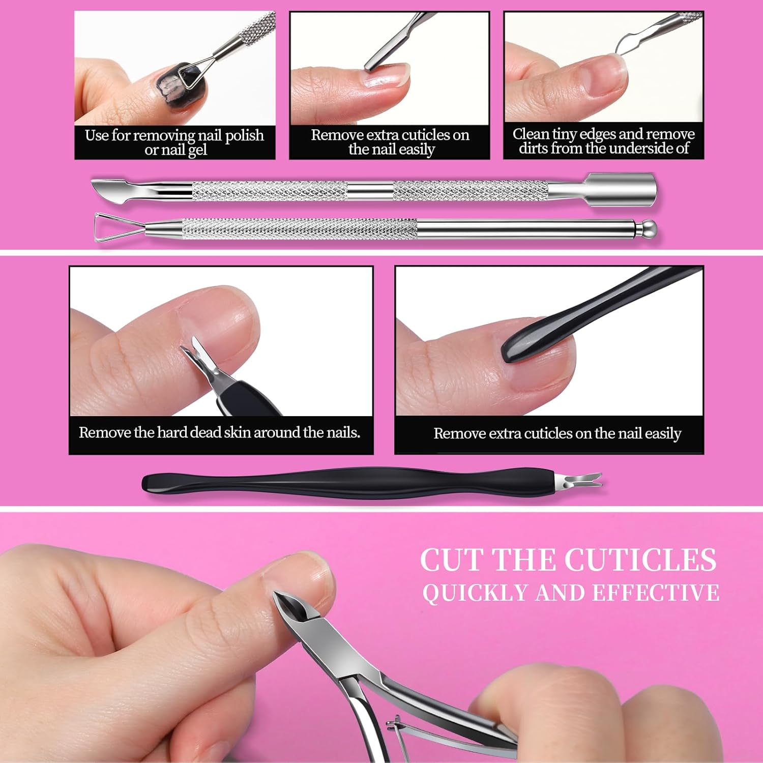 - Complete Cuticle Tools: The special triangular cuticle peeler can remove the nail polish and gel easily. The triangular side of cuticle pusher is very suitable for removing residue and dirt under nails. The spoon-shaped side used for pushing the cuticles together. The curved head cutter of the nail cuticle nippers can cleanly and evenly cut the cuticle to ensure that the dead skin and cuticle easily removed. The cuticle fork can remove the hard dead skin around the nails.