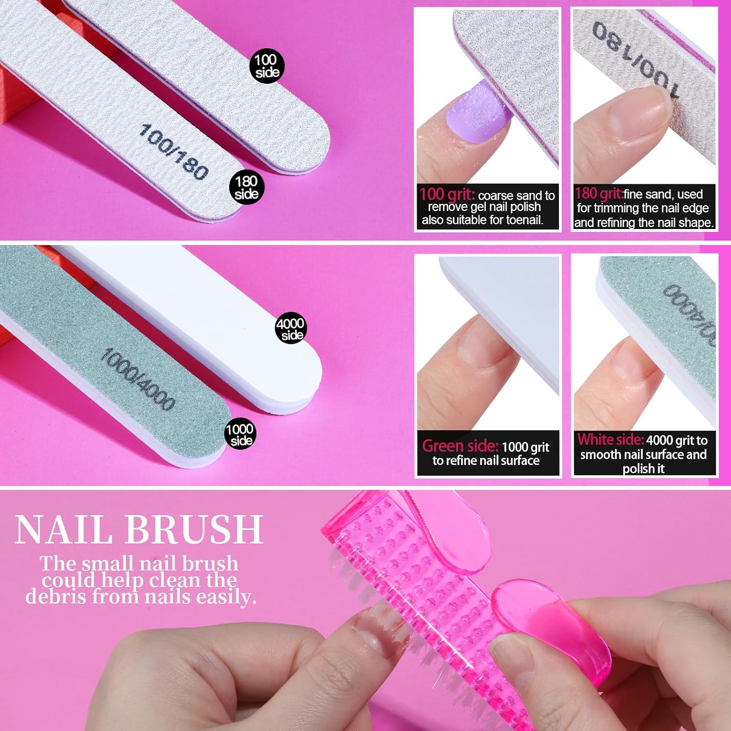 - Practical Tools For Filing & Polishing: The nail files 100/180 grit in small size are coarse-grained, suitable for removing nail gel or nail polish, also for toenails. For accurate filing on the edges of the nail and trimming the shapes and length according to your needs. The polishing files 1000/4000 are suitable for polishing uneven nail surface to make your nails smooth and shiny. The small nail brush can help to easily brush the residue off the nails.