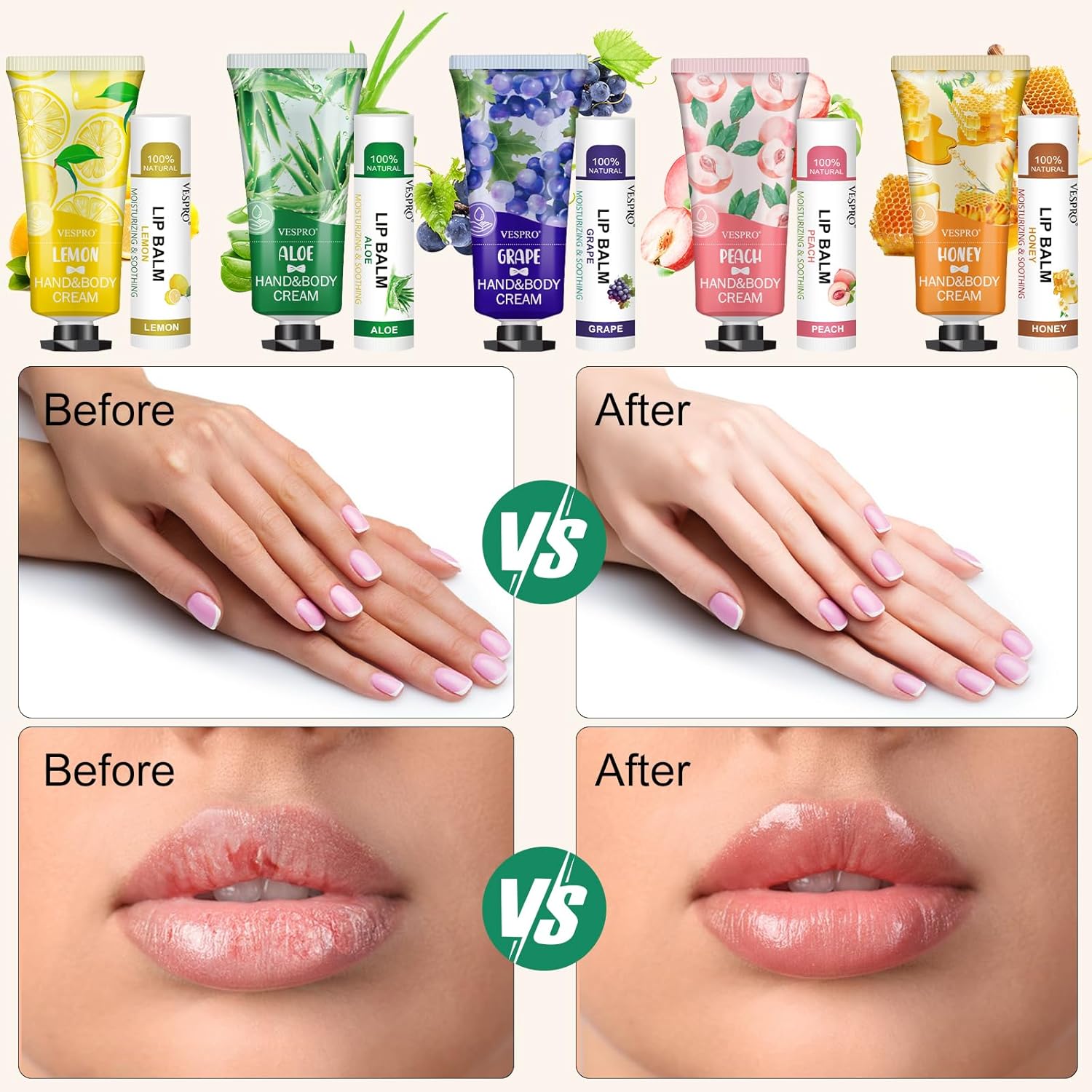 - 【Unique Party Favors for Guests】Our hand cream bulk and lip balm bulk Set have 5 different fragrances - Lemons,grapes,peaches,aloe and honey.In addition,5 different colors are perfect for weddings and party,these thank you gifts can be distributed as gratitude gifts to guests and coworkers.