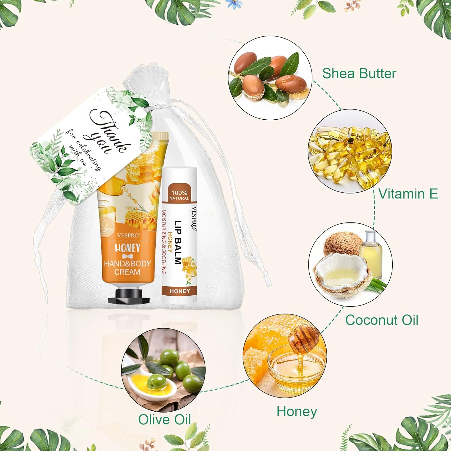 - 【50Pack Thank You Gifts Sets】This appreciation gifts set includes 50pcs hand creams,50pcs lip balms,50pcs organza gift bags,50pcs thank you cards and 1pcs DIY manual.sufficient quantity and perfect combination to meet your guest gift needs.