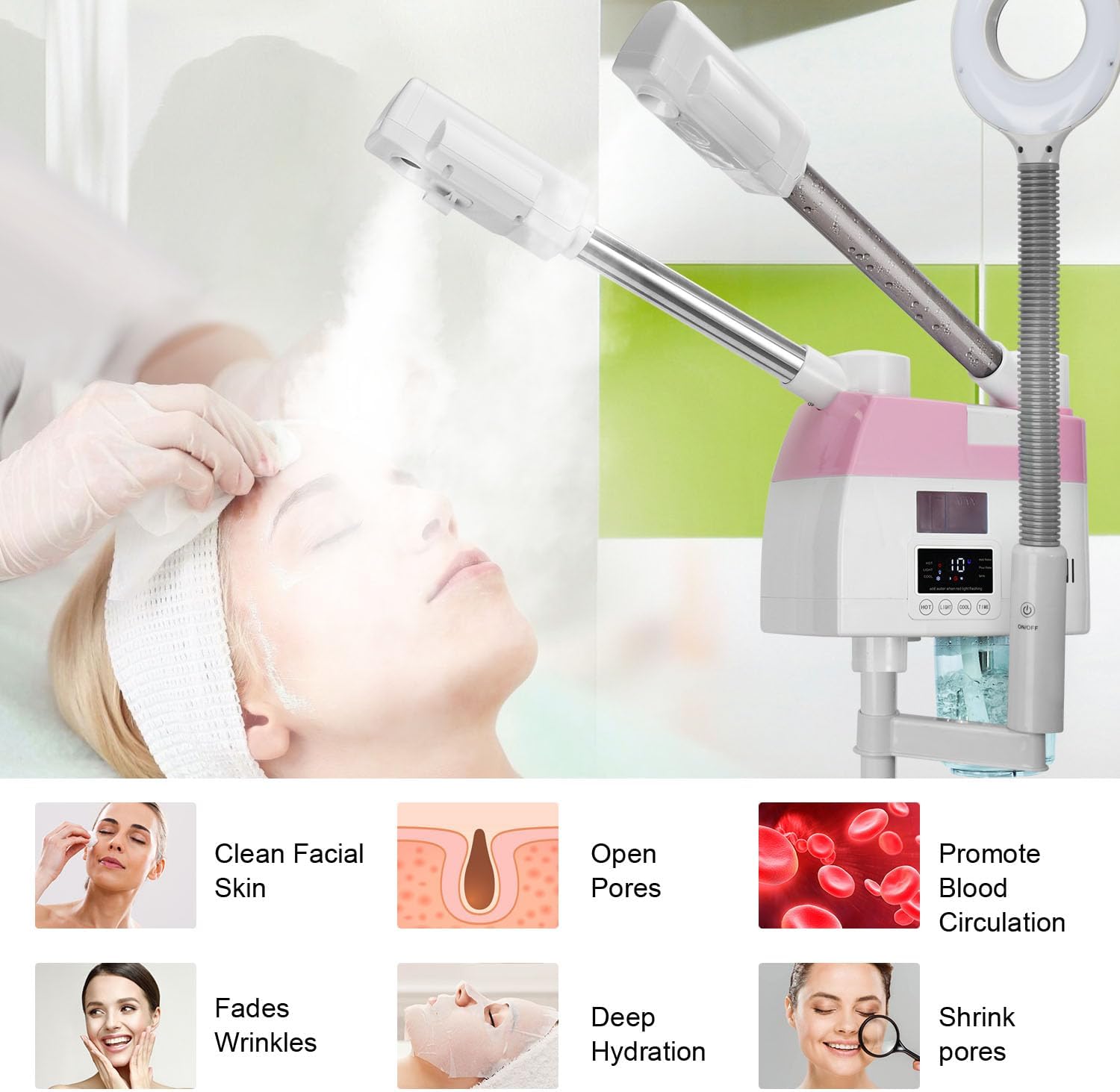 - 💗【5X Magnifying Lamp】Professional facial steamer with 5X magnifying lamp, 3-speed adjustable light brightness,bright and soft light does not hurt the eyes, the arm can be flexibly bent and rotated.