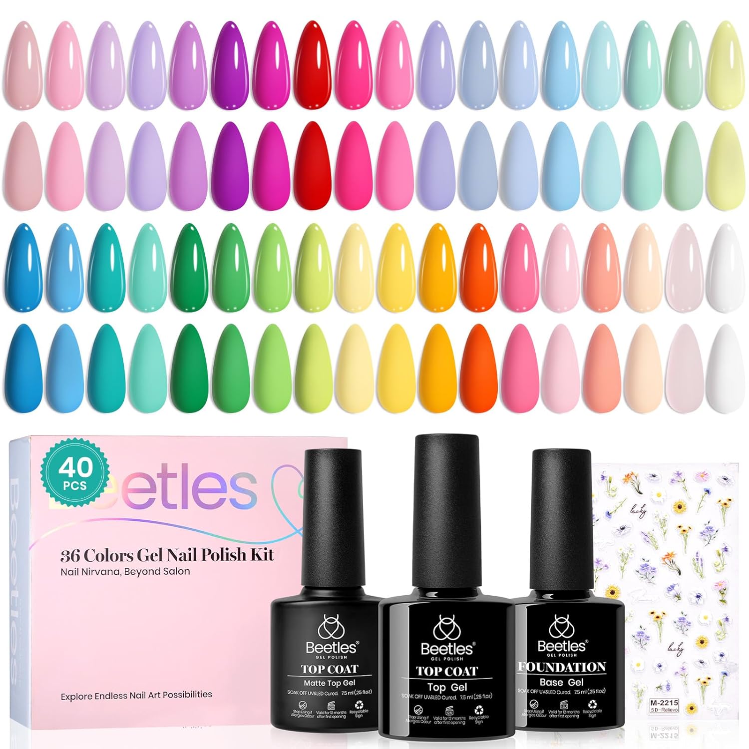 beetles Gel Nail Polish Set - 40 Pcs 36 Colors Nail Polish Kit Pink Red Green Blue Color Gel with Base&Glossy Matte Top Coat UV LED Petal Symphony Collection Nail Art Halloween Gifts for Women