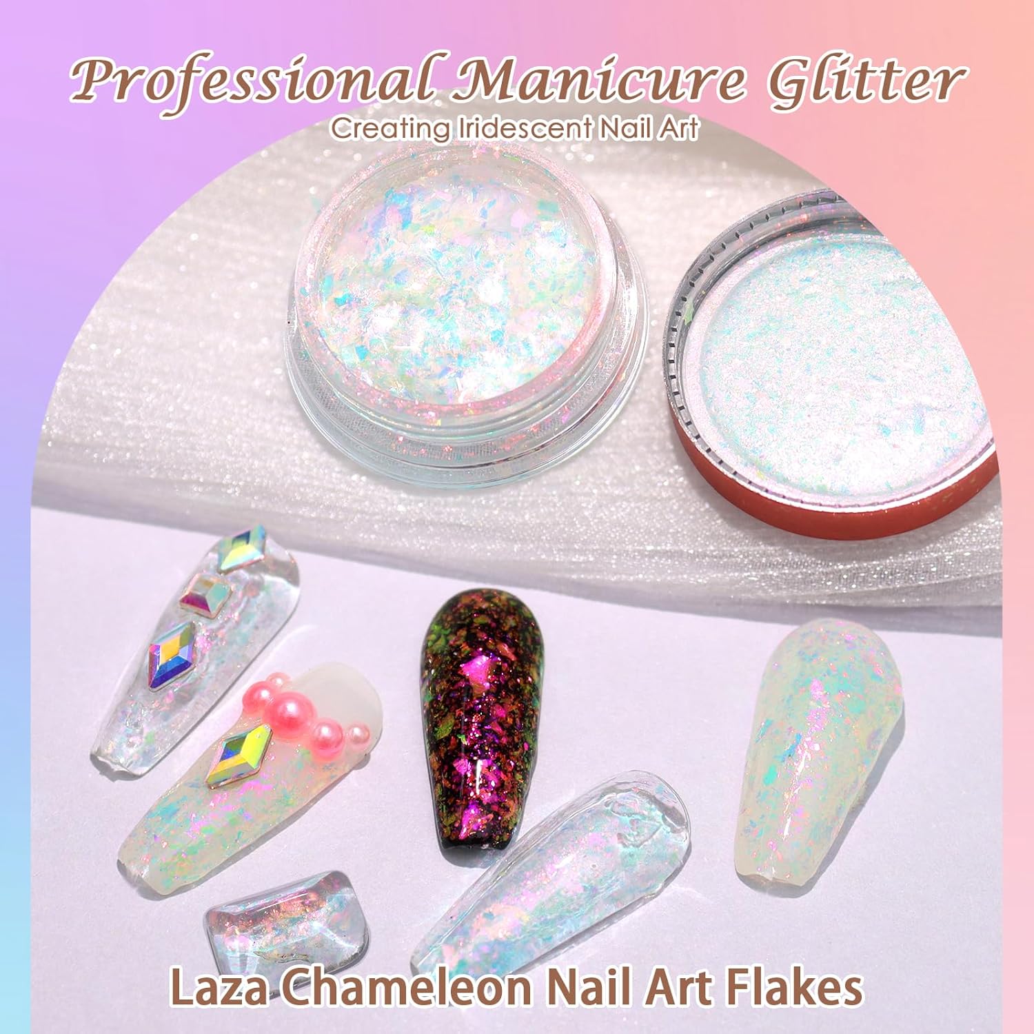 - Color-shift Effect: Laza iridescent nail flakes are specially processed to reach muti-color shifting effect. Each color of foil flakes appears at least two colors at the same time. Apply it on the different color base and you will get different chameleon effects. Great for making mermaid nails, marble nails, opalescent nails and so on.