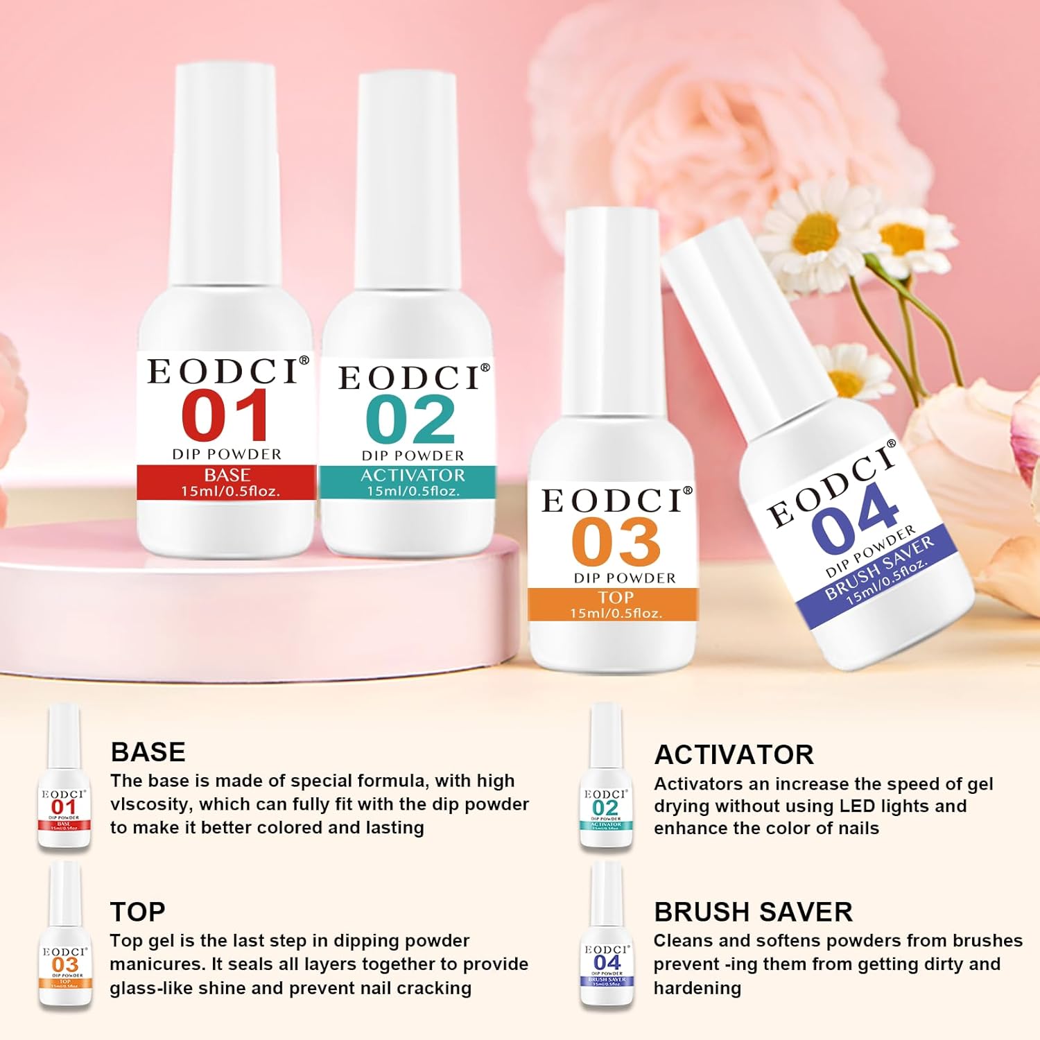 - ăNo Lamp NeededăEodci Nail Dipping Powder does not require UV/LED light to cure, is skin friendly while avoiding skin darkening and damage, safe and easy to use, suitable for beginners and professional nail salons.