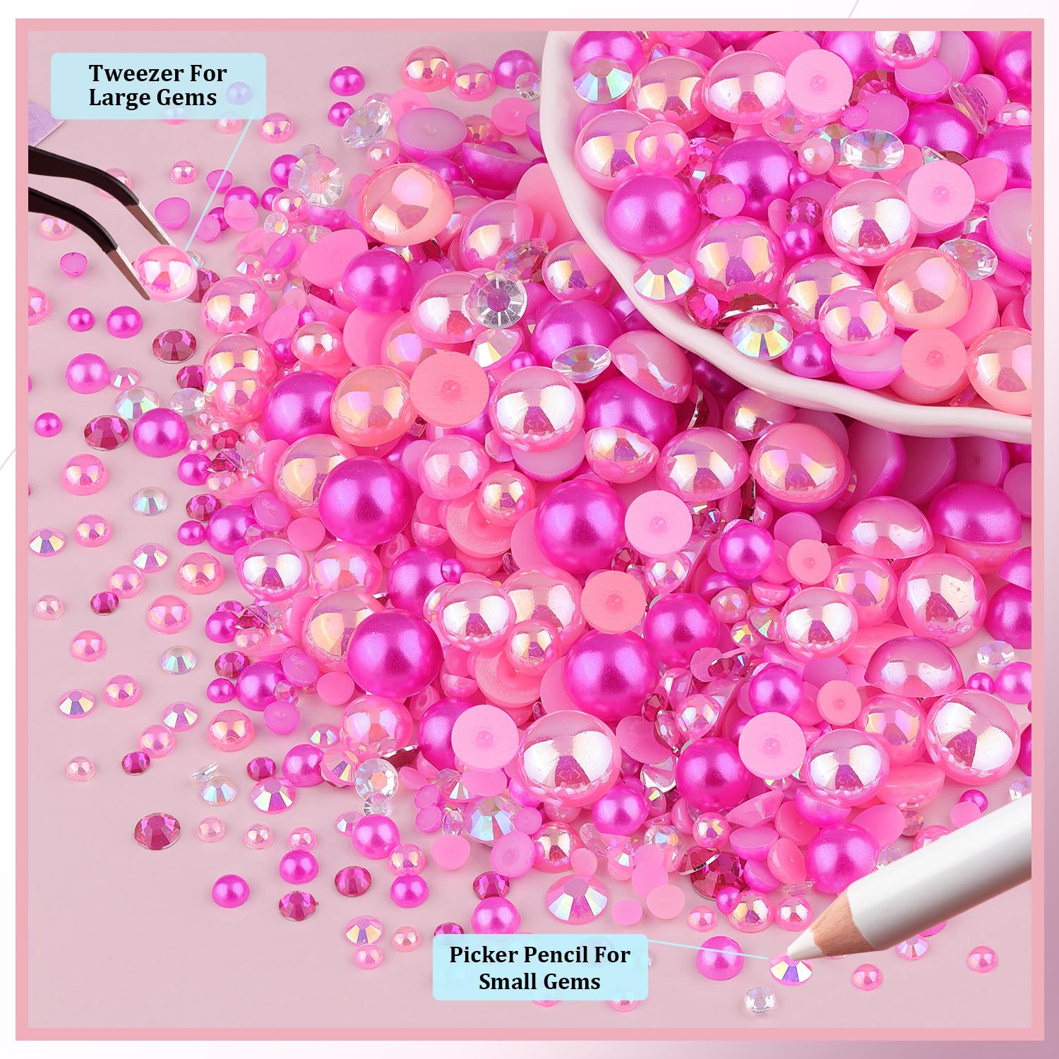 - ✦WHAT YOU WILL RECEIVE: A bag of 80g mixed-color flatback pearls and rhinestones to meet your different needs. Besides, this set of half pearls and gems also with a tweezer and a picker pencil, which help you spare no effort to pick up the beads.