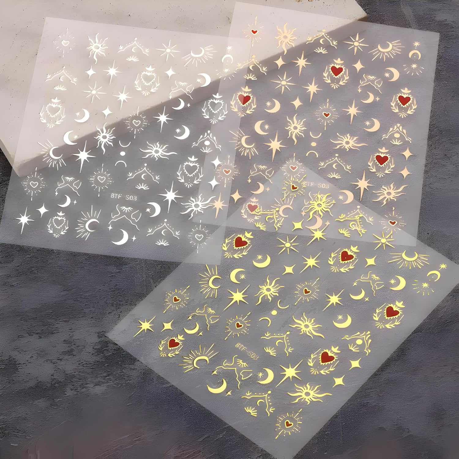 Star Nail Art Stickers - 12 Sheets, 3D Self-Adhesive Gold Moon, Red Heart, Silver Star Designs for Nail Art Decoration