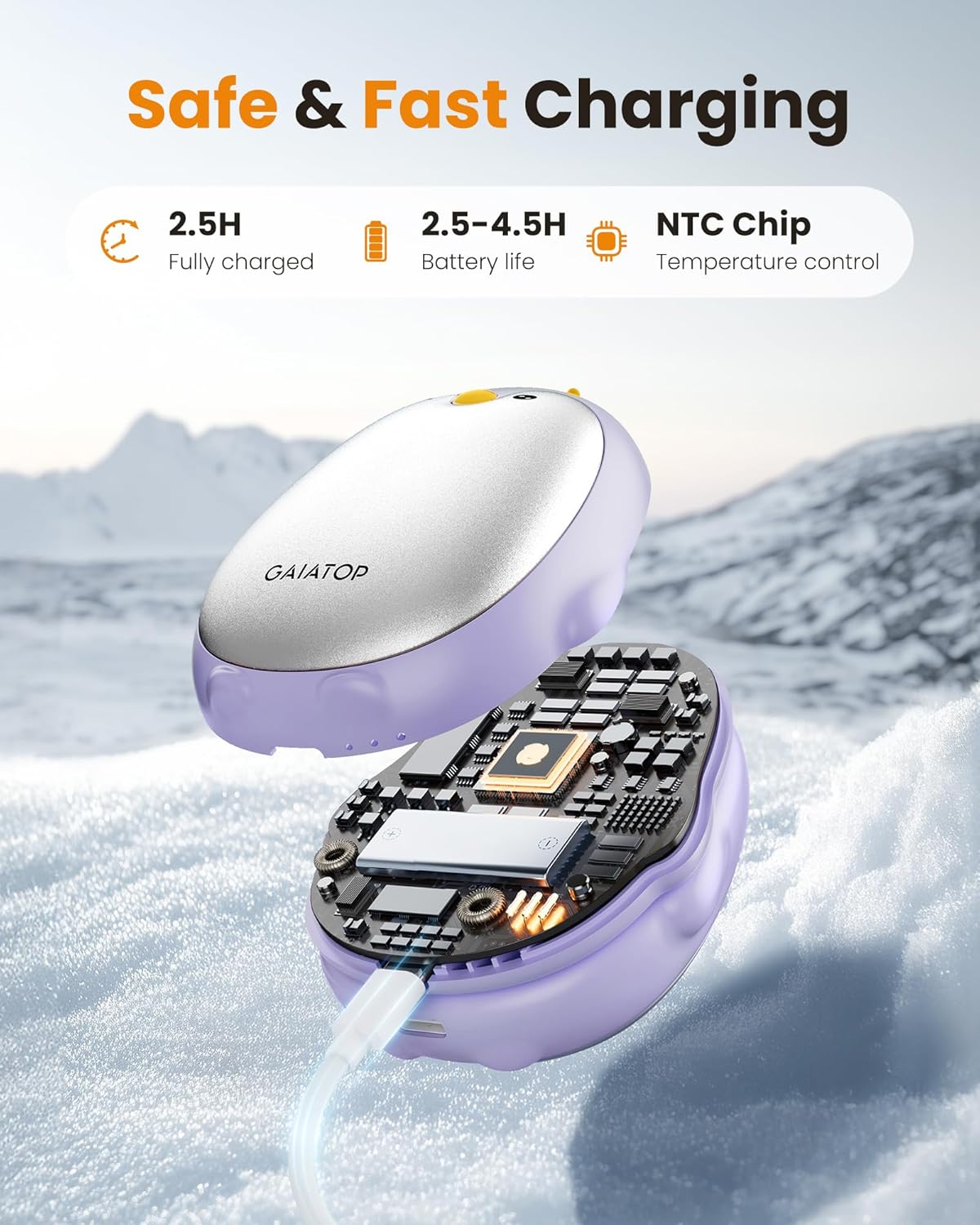 - Long-Lasting Hand Warmers Rechargeable: The reusable electric hand warmer built-in rechargeable batteries, battery life last about 2.5-4.5 hrs, comes with 2 usb cables, the wamer can be fully charged at the same time within 2.5 hrs