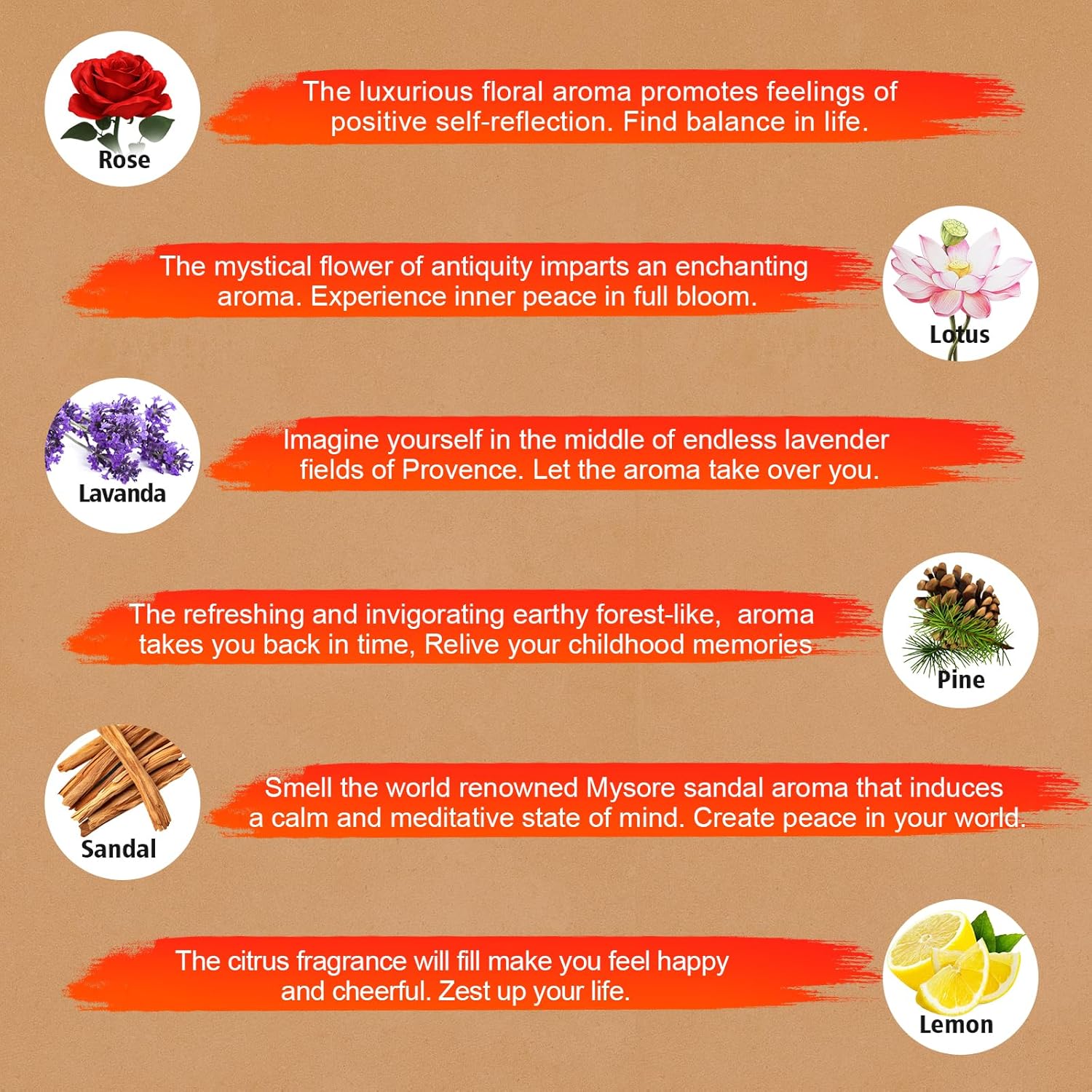 - Material : Lotus, Lemon, Lavanda Pine, Sandalo,Dragons Blood,White Sage,Agarwood,Patchouli,Myrrh,Amber