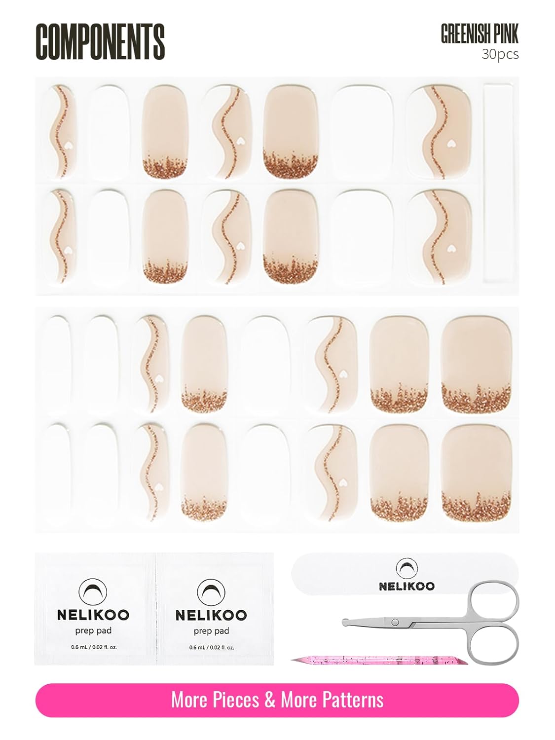 - ăNail Kit IncludedăEach set includes everything you need for a perfect manicure: 30 pcs semi-cured gel nail strips, nail file, cuticle stick, and prep wipes. It's a nice choice designed for both beginners and experienced users. And we provide 7X24 hour service, if you have any questions, please let us know