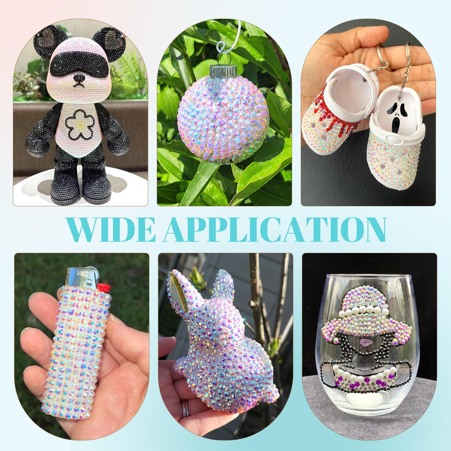 - šWIDE APPLICATION -- These sparkling iridescent resin crystals are perfect for creating dazzling looks. Use them for bedazzling DIY crafts like shoes, tumblers, mugs, bottles, phone cases, popsockets, scrapbooks, photo frames, diamond paintings, greeting cards, bags, glasses, guitars, keychains, hats, masks, hair clips, bracelets, wristbands, clothing, wedding dresses, and more. Apply it to what you want to bling!