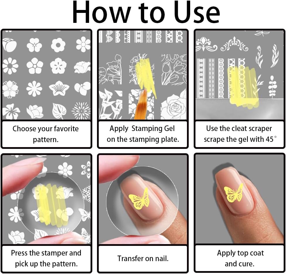 - Easy to Use: 1. Apply paint adhesive to the stencil, then use a scraper to quickly scrape off the excess 2.Use a silicone stamper to press down on the transfer pattern 3. Quickly transfer the pattern onto your nails 4.Bake dry to apply sealer then shine the lamp