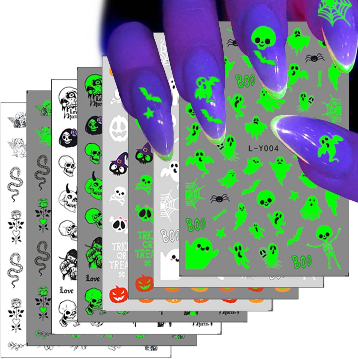 4 Sheets Halloween Nail Art Stickers Luminous Halloween Nail Stickers Glow in Dark Nail Art Design White Spooky Nail Decoration Cute Ghost Bat Spider Nail Decals for Women Girls Holiday DIY