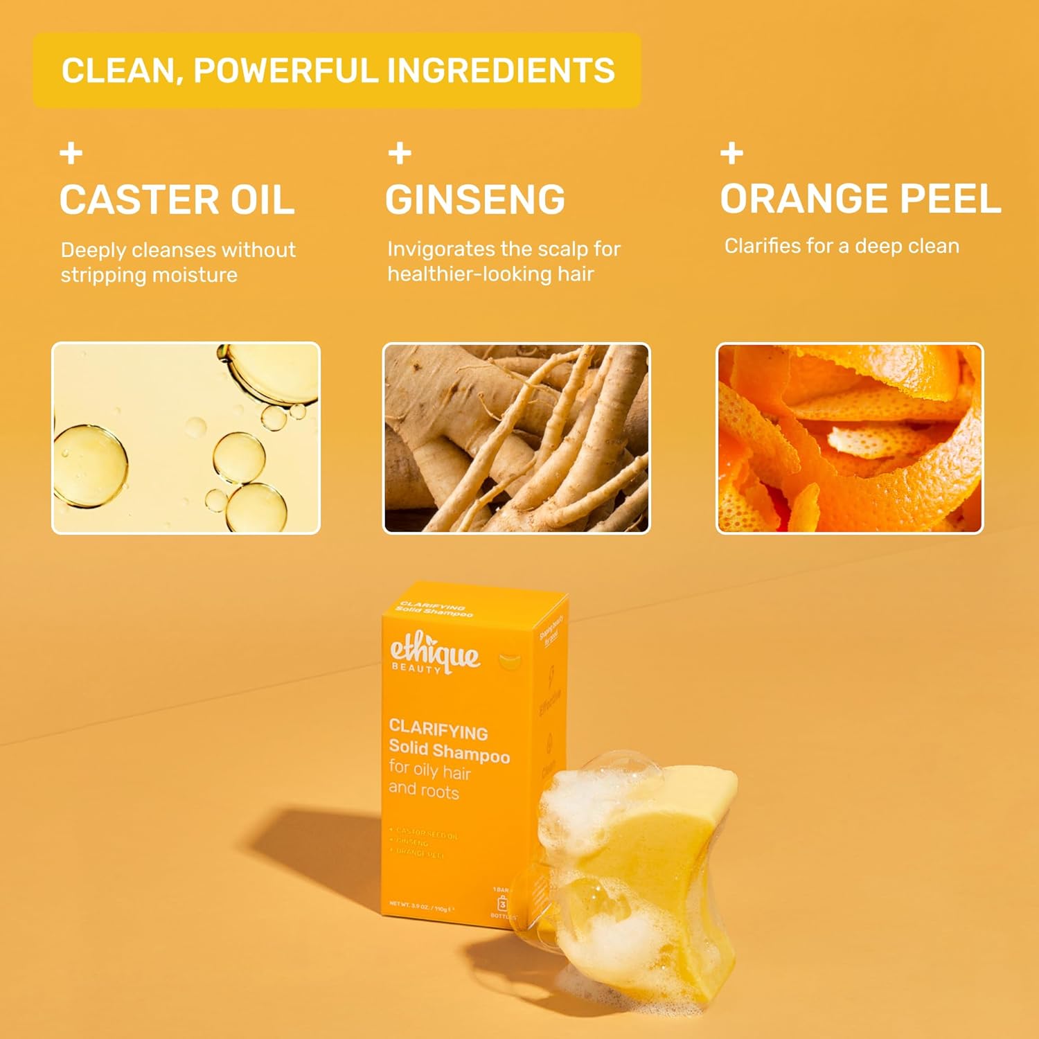 - PURIFY & REFRESH: Banish excess oil and buildup with our Clarifying Shampoo Bar. Infused with castor seed oil for gentle cleansing, ginseng to invigorate the scalp, and orange peel for a deep, refreshing clean. Enjoy healthier, revitalized hair with every wash.