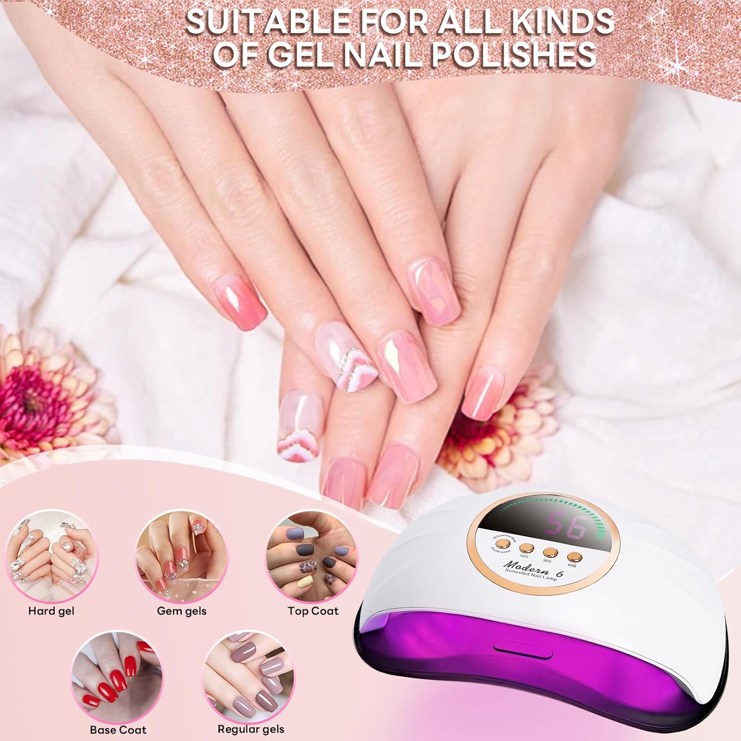 - 【Curing All Gel Nail Polishes】UV light for nails works with all gel brands. Base/Top Coat, Color /Hard /Poly/Sculpture Gels,Builder, Acrylic, Gem Glue etc. (not for regular/air -dry nail polish). Enjoy high-quality salon manicures at home with your friends and family.