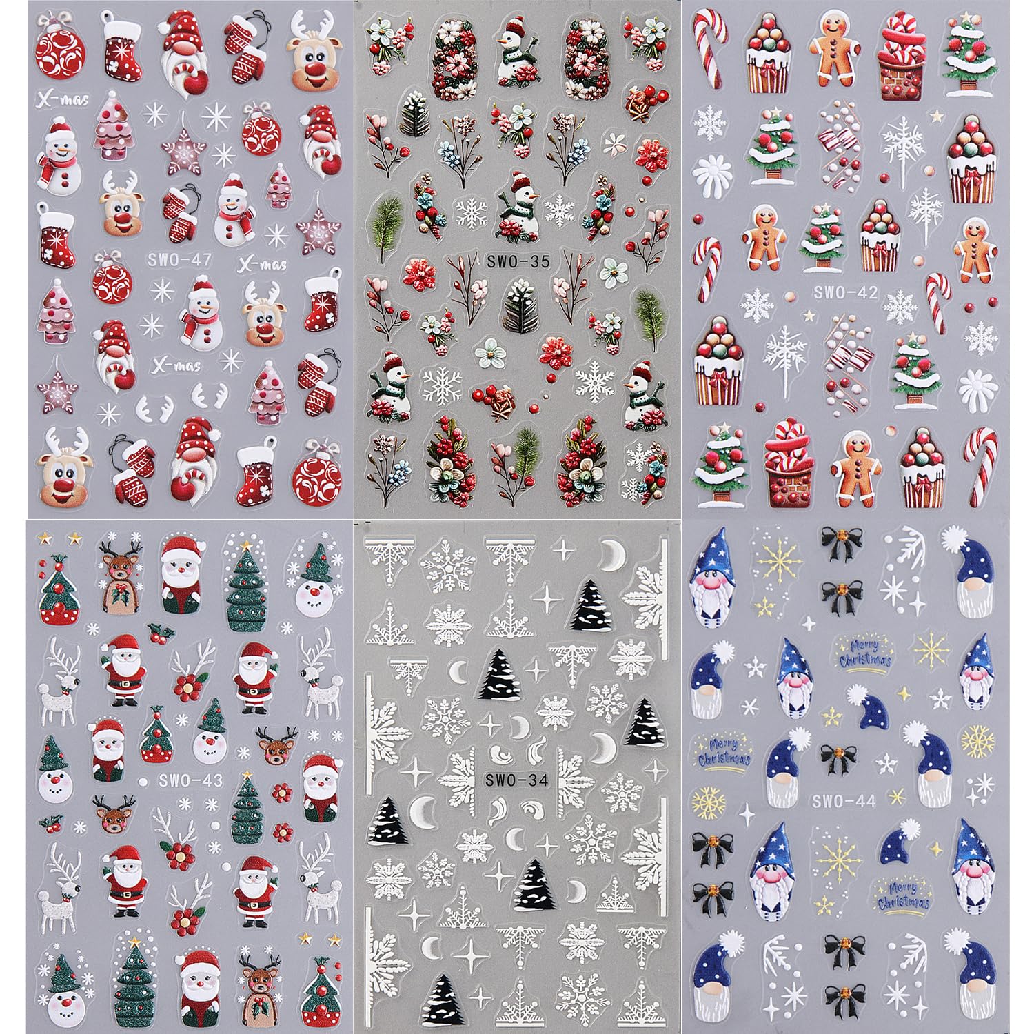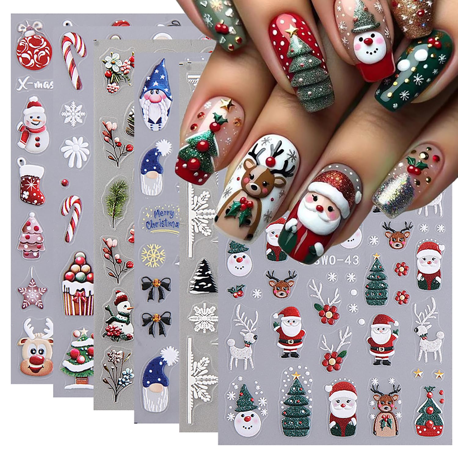 - Festive Designs: Includes 6 sheets of 5D Christmas nail art stickers featuring adorable Santa Claus, reindeer, and bluebird designs for a fun holiday look