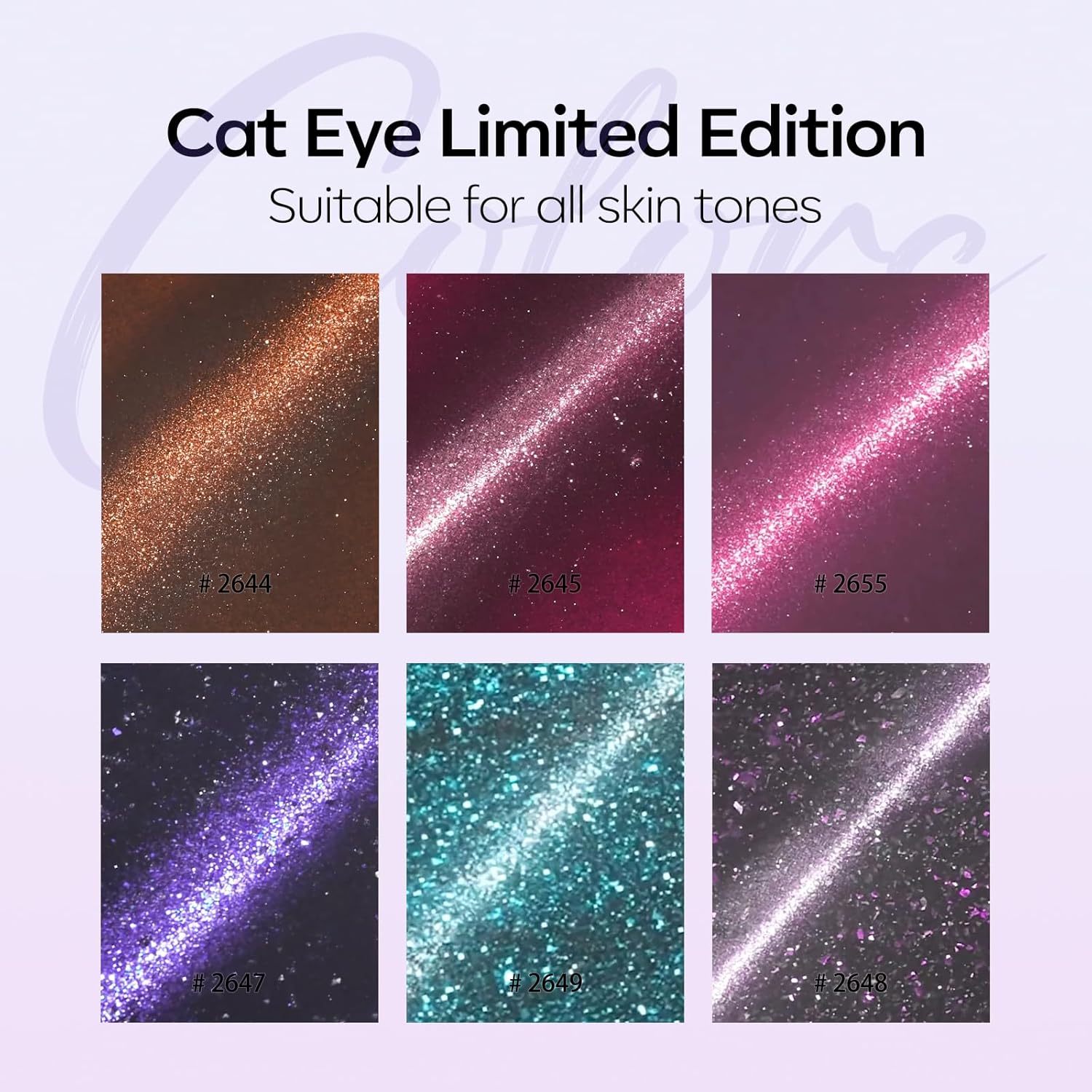 - What You Get: 6 Colors of Colorful Galaxy Holographic Glitter Cat Eye Gel Nail Polish (7ml/0.24 fl. oz each) + 1 Double-Head Magnetic Stick for various cat eye designs. Practice makes perfect in cat eye gel !