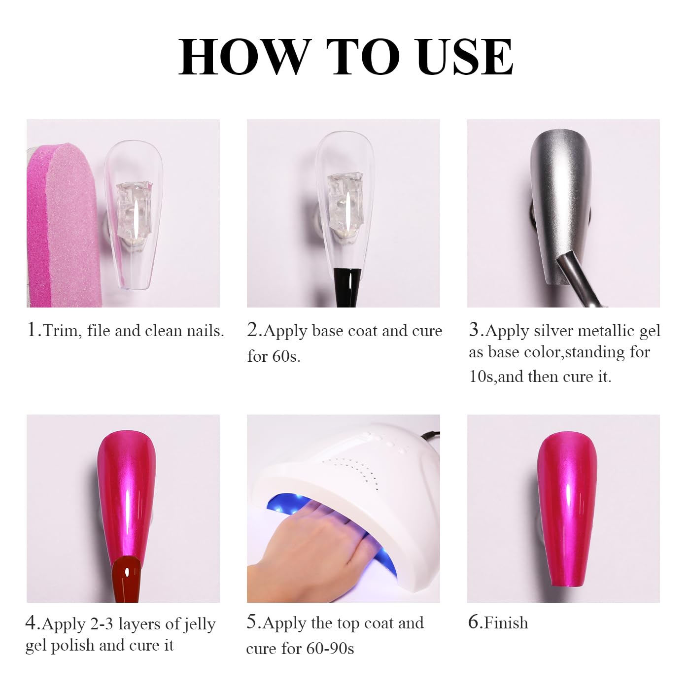 - Chrome Gel Nail Polish Kit:You'll get a bottle of metallic gel polish and a bottle of sky blue jelly gel nail polish.The shades are sheer, you can use it alone(no colored under coat) you get a sheer but spring summer color effect. If you apply with the metallic silver gel,you will sky blu colors highly shine chrome manicure.