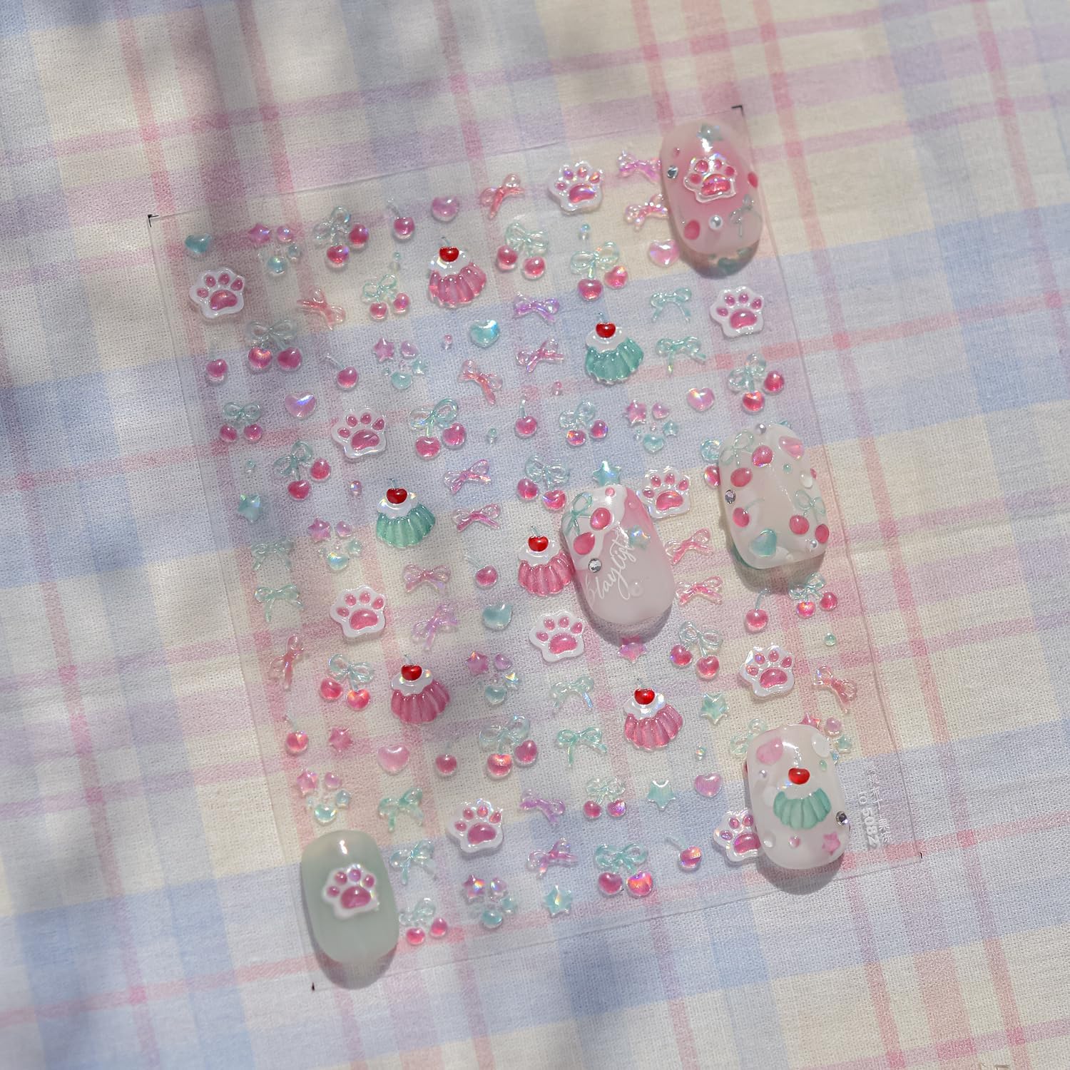 5D Embossed Cake Nail Sticker for Nails Art Pink Nail Decals Cherry Bow Nail Art Stickers Cute Nails Decal Self Adhesive Manicure Supplies Decoration for Women Girls Kid