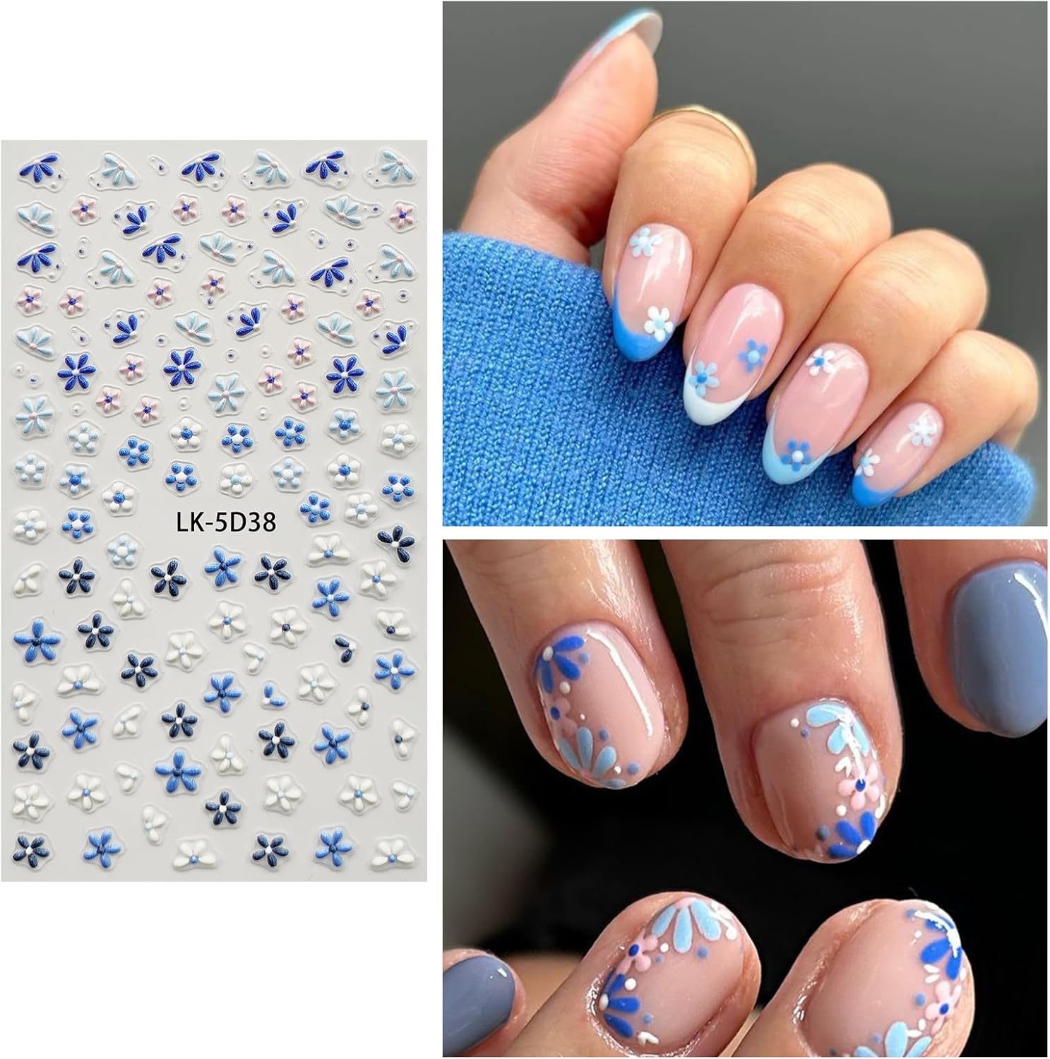 Nail Art Stickers Decals 5D Embossed Flower Nail Decals Self Adhesive Spring Summer Nails Supplies 3D Design for Women Nails Decoration Fresh Blue Purple Flower Stickers