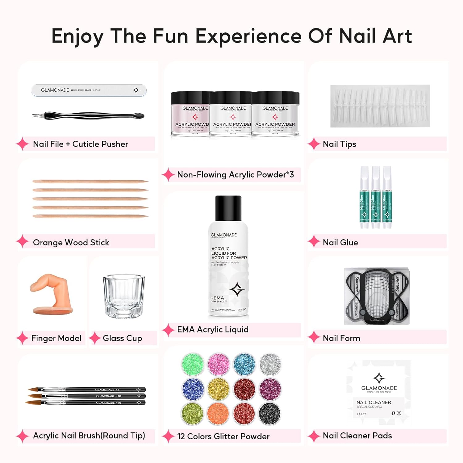 - Included Components : Acrylic Powder, Glitter Powder, Gel Polish, UV Lamp, Nail Tools, Nail Tips, Glitter Sets, Sequins
