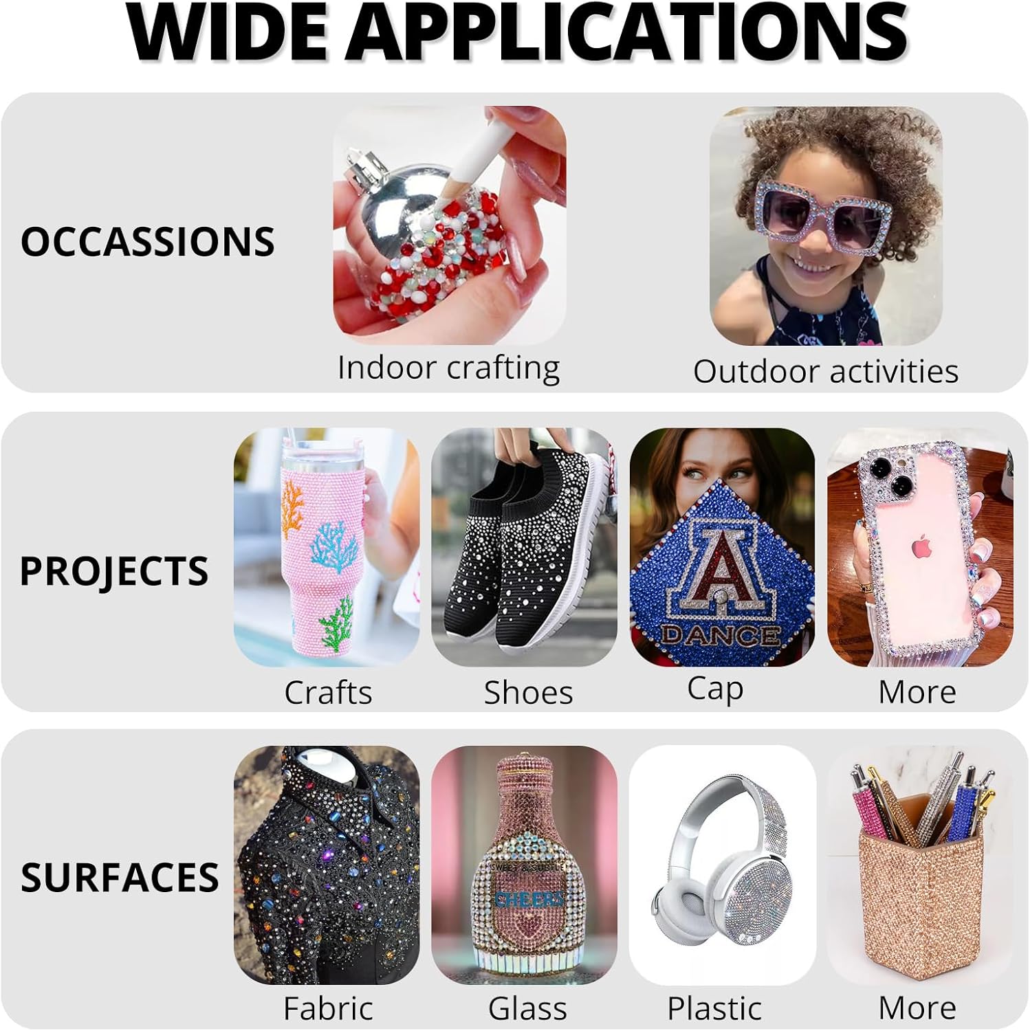 - Easy to Use -- This kit is designed to be straightforward, and versatile for various crafting projects. The manual is user-friendly and beneficial for both novice and experienced crafters. The complete and durable tools are suitable for precisely applying rhinestones to create intricate designs, with no additional tools required. Rhinestones are easy to apply and remove. The sturdy container with 24 grids keeps all rhinestones organized by size and color, making them easy to store and access