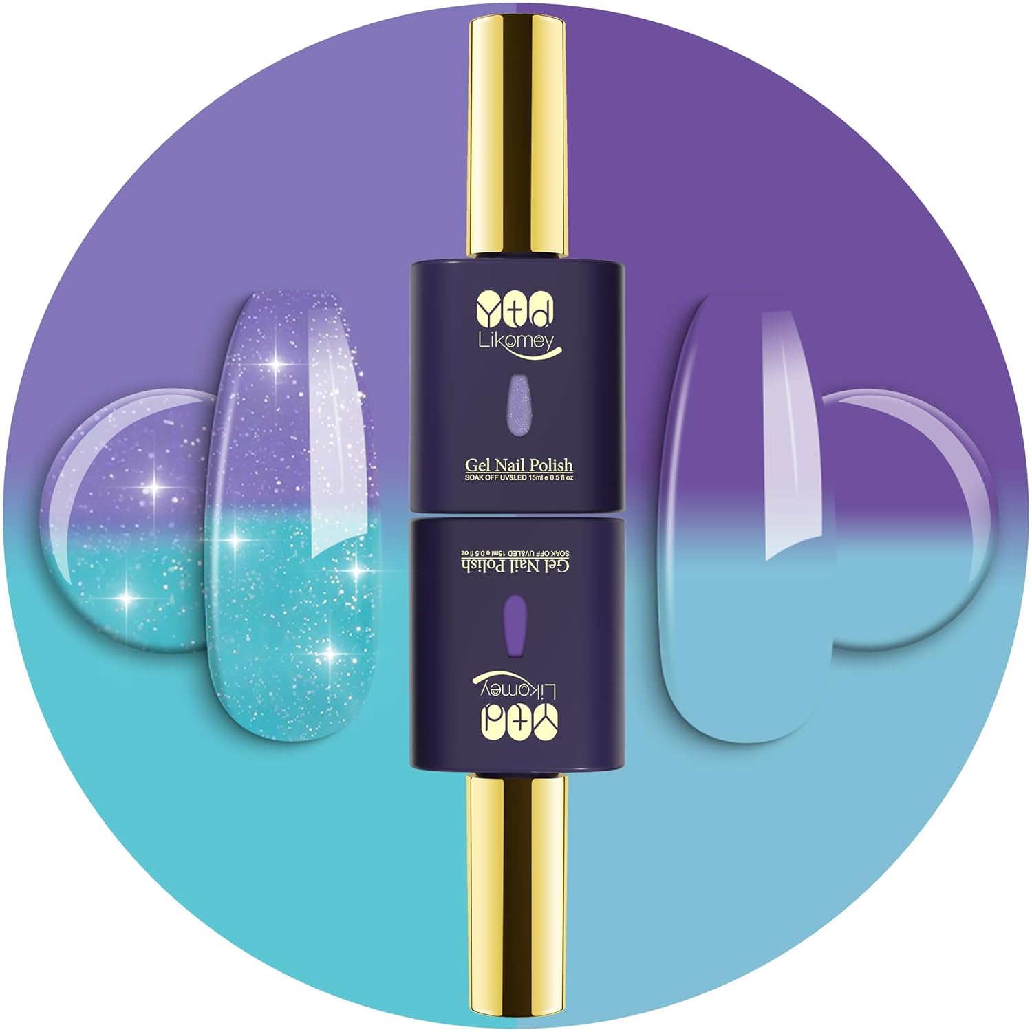 YTD Likomey Color Changing Gel Nail Polish 2 Pcs Set,15ml Tiffany Blue To Purple Pure Color and Glitter Kit,Thermal Ombre Change Colors Salon Manicure Fall Winter UV Nail Varnish,WB2-8
