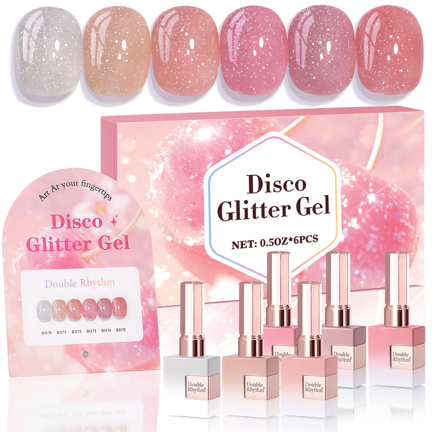 Double Rhythm 0.5 Oz Glitter Gel Polish Set of 6 Color with Display Board 15 ml Full Size Kit Shimmer Reflective Sparkle Soak Off Manicure Salon DIY at Home (Silver Nude Rose Coral Pink-T6-39)