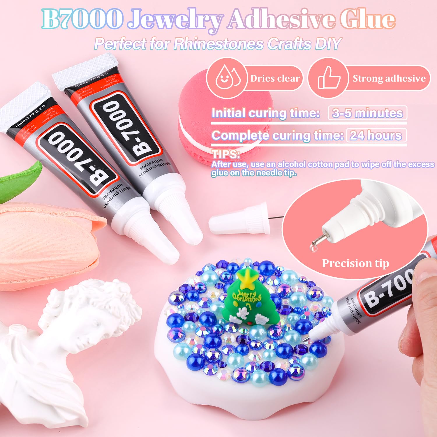 - B7000 CLEAR GLUE FOR GEMS -- Strong adhesion and dries clear, precision needle for easy application. The initial cure time is 3-5 minutes and the full cure time is 24 hours. After use, the needle should to be wiped with an alcohol pad