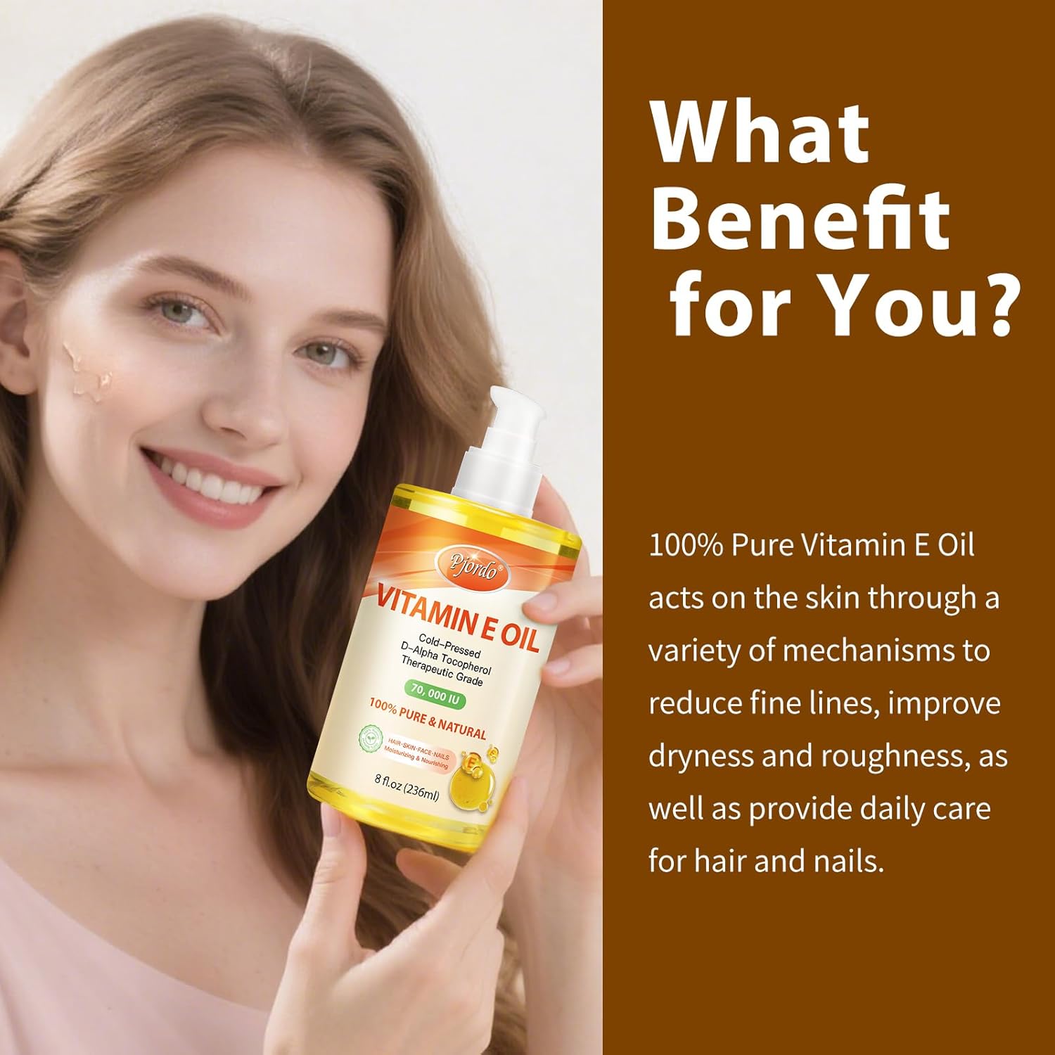 - 70, 000 IU Offers Skin Protecting: Pjordo 70,000 IU organic oil contains and is formulated with 100% pure & natural vitamin e, which allows it to act more directly and effectively on the skin or body, it also provides skin care for scars, dark spots and reducing fine lines.