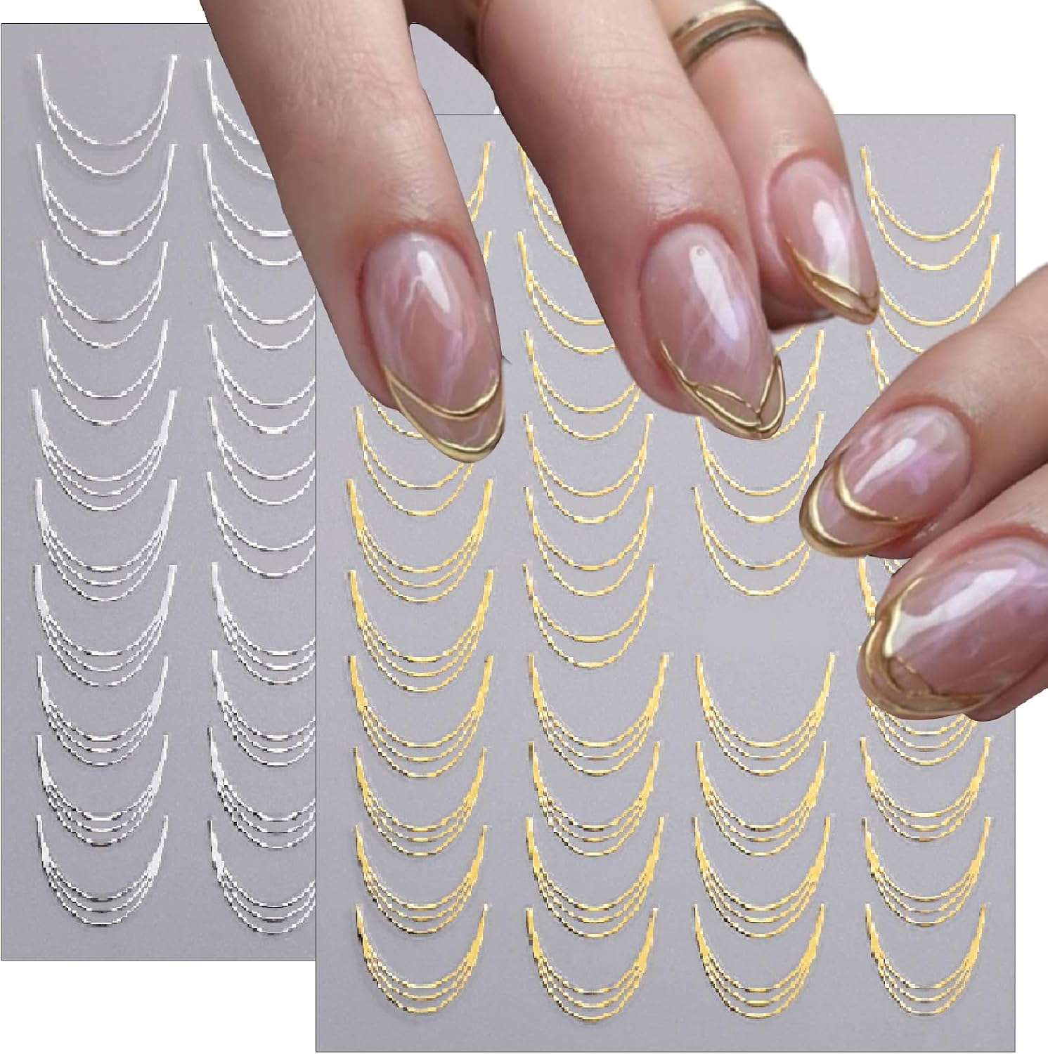 6 Sheets Lines French Tip Nail Art Stickers Gold Silver French Line Nail Decals 3D self-Adhesion Curve Lines Design French Nail Art Supplies for Women DIY Manicure Decoration