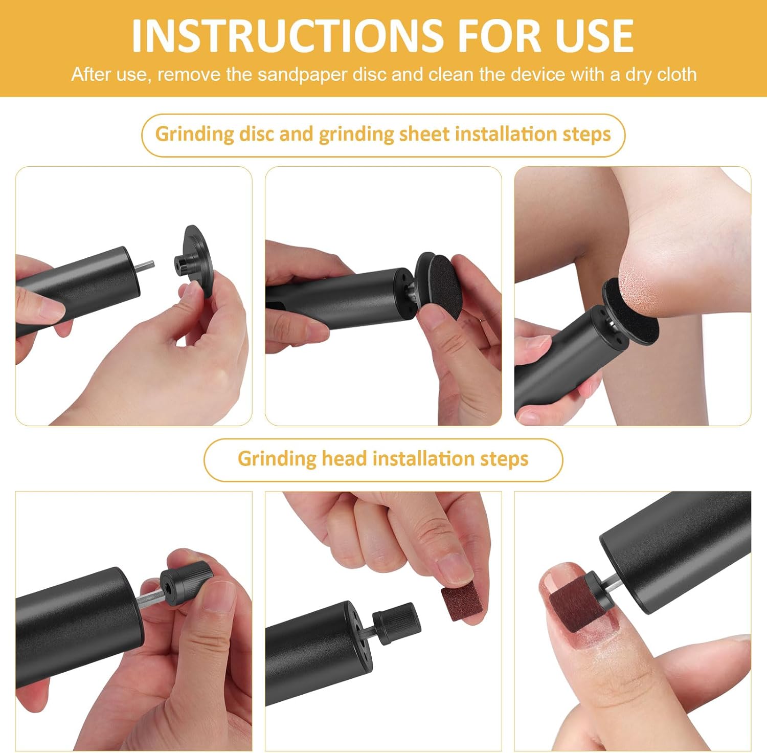 - Package Includes】:5.9-inch device × 1,USB charging cable × 1,Premium metal heads × 2 (Callus mode / Nail mode),80 grit for calluses ×10,120 grit for sensitive areas ×10,Ring sandpaper for nail polishing × 10,User manual × 1