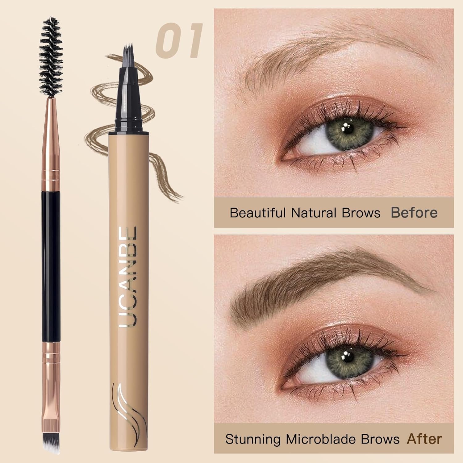 - 【UCANBE NEW UPGRADED MICROBLADING EYE BROW PEN】With innovative patented angled square brush head, precise length and proper density of soft bristles and ultra-fine brush tips, UCANBE brow-fection eyebrow pen are easy to control for an accurate & seamless application. Unlike other ordinary flat brow brushes, our square brush needs no repeated strokes, it’ll give you an instant 4D defined look and save your time anytime, anywhere. It’s perfect for quick touch-ups, whether you’re rushing in the morning or need a refresh look being outside, it ensures convenience alongside with its effectiveness.