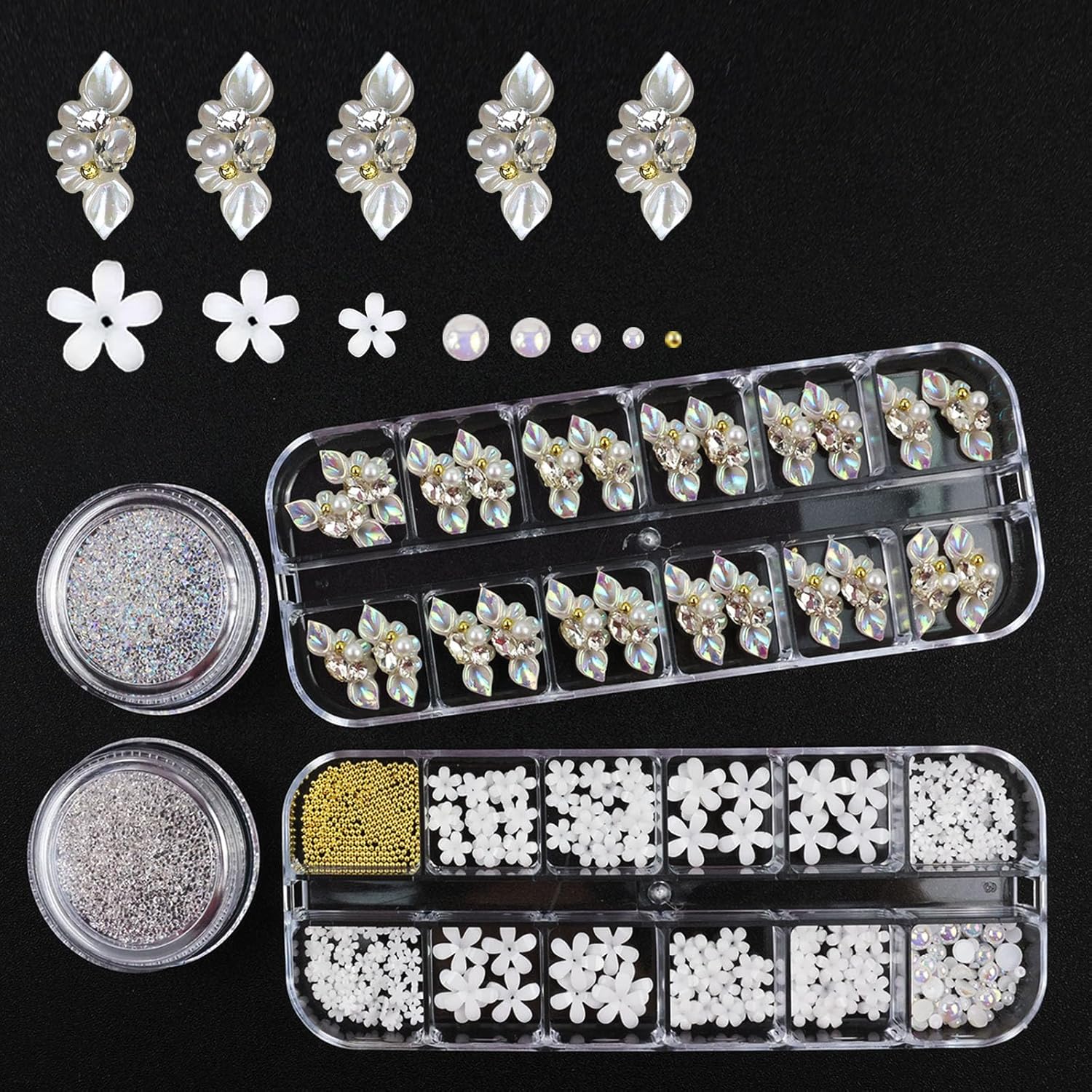 - 【Package Contain】You will get 2 boxes of white 3D nail charms and 2 boxes nail rhinestones, which are also mixed with gold and white nail pearls, which can meet your daily needs for nail design.