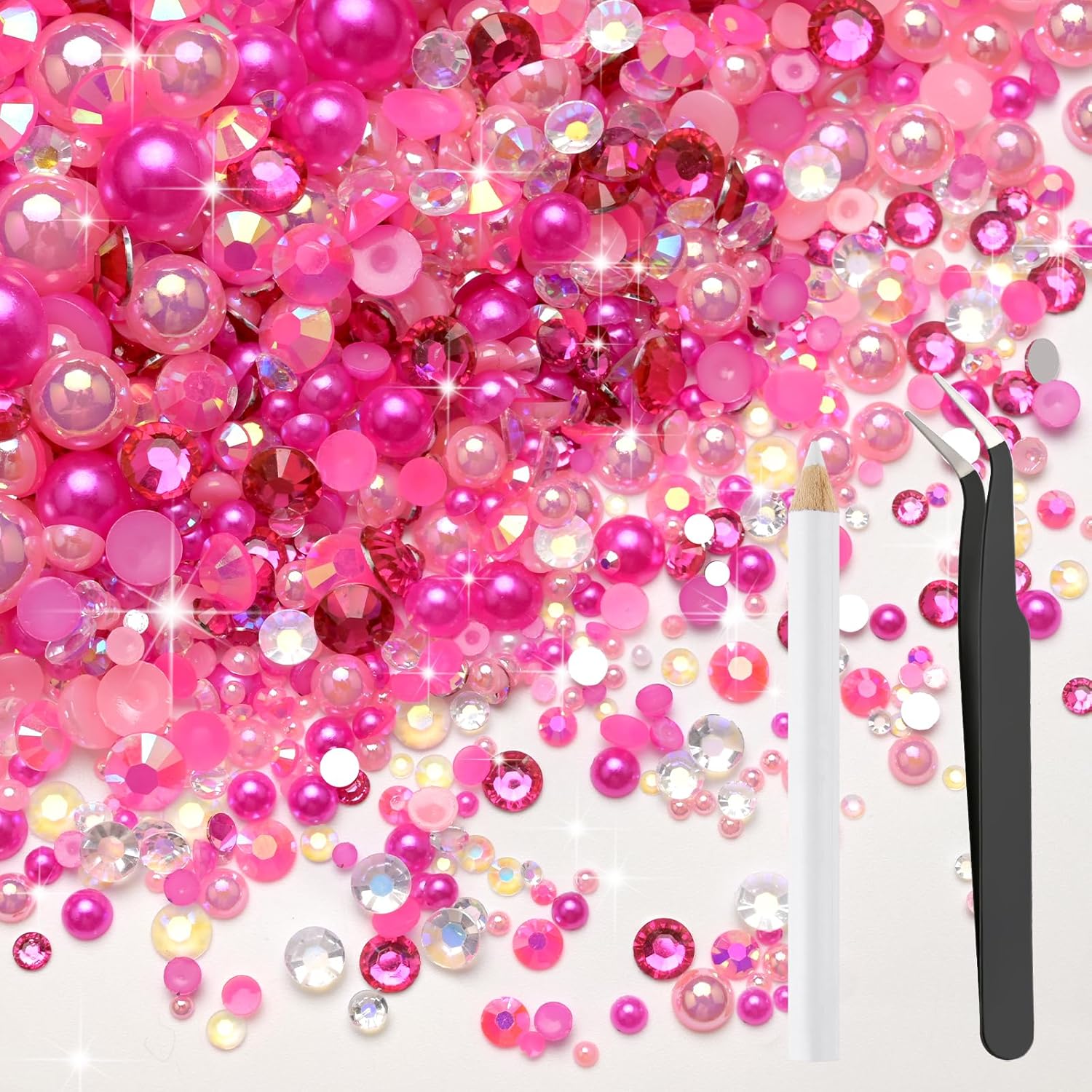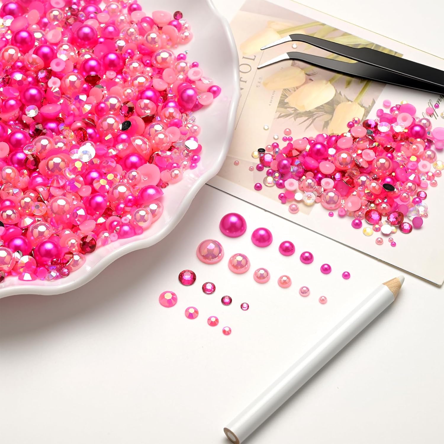 - Complete Crafting Kit: Comes with tweezers, and wax pickup pen effortlessly apply pearls and rhinestones to Any Surface,Which will not harm your nails and skin. The stylish pearl for crafts flat back rhinestones has a pretty and a shiny surface, show your chic and glamour bedazzle gems