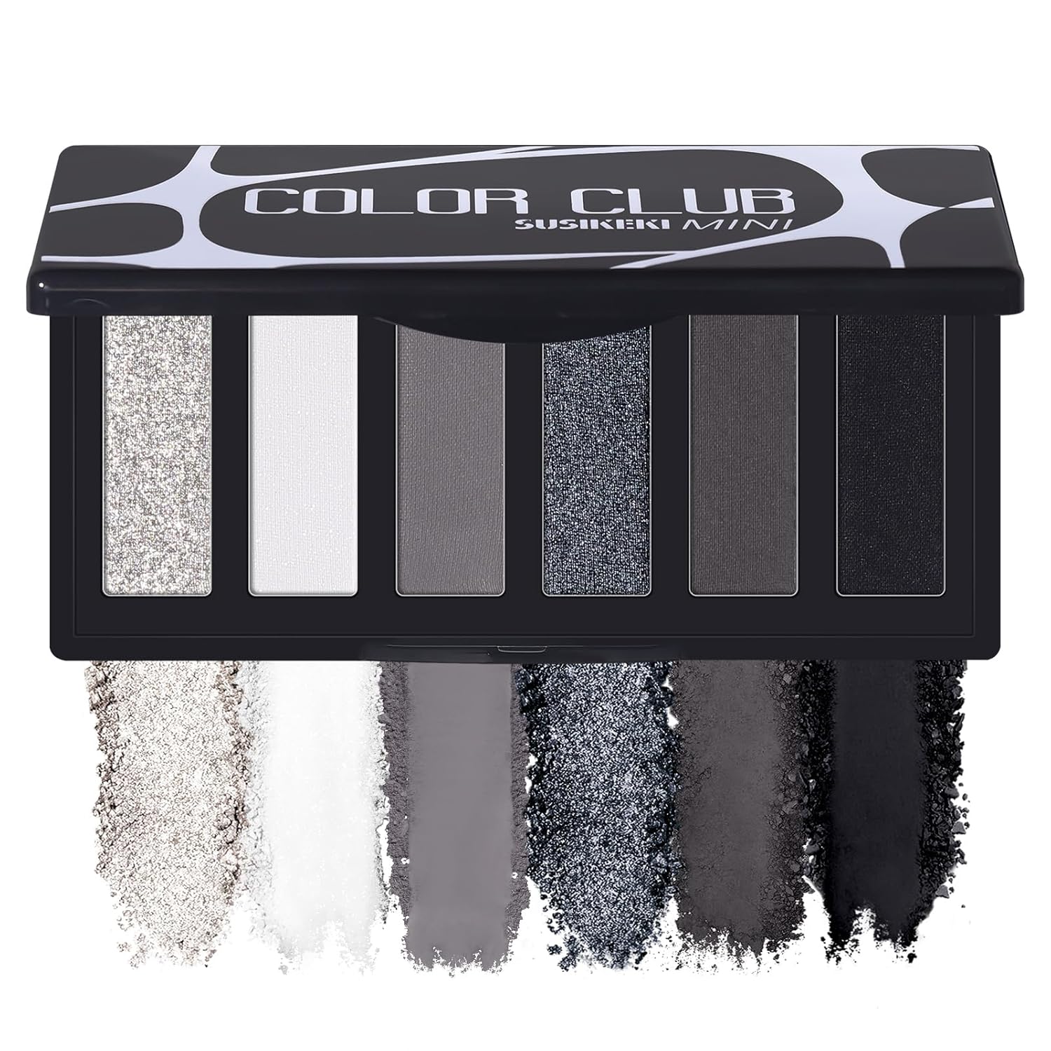 - 【Smokey Silver to Deep Black Tones】This palette features six cool-toned shades—silver glitter, soft gray, charcoal, and matte black—ideal for creating intense, dramatic eye looks with both matte and shimmer finishes.