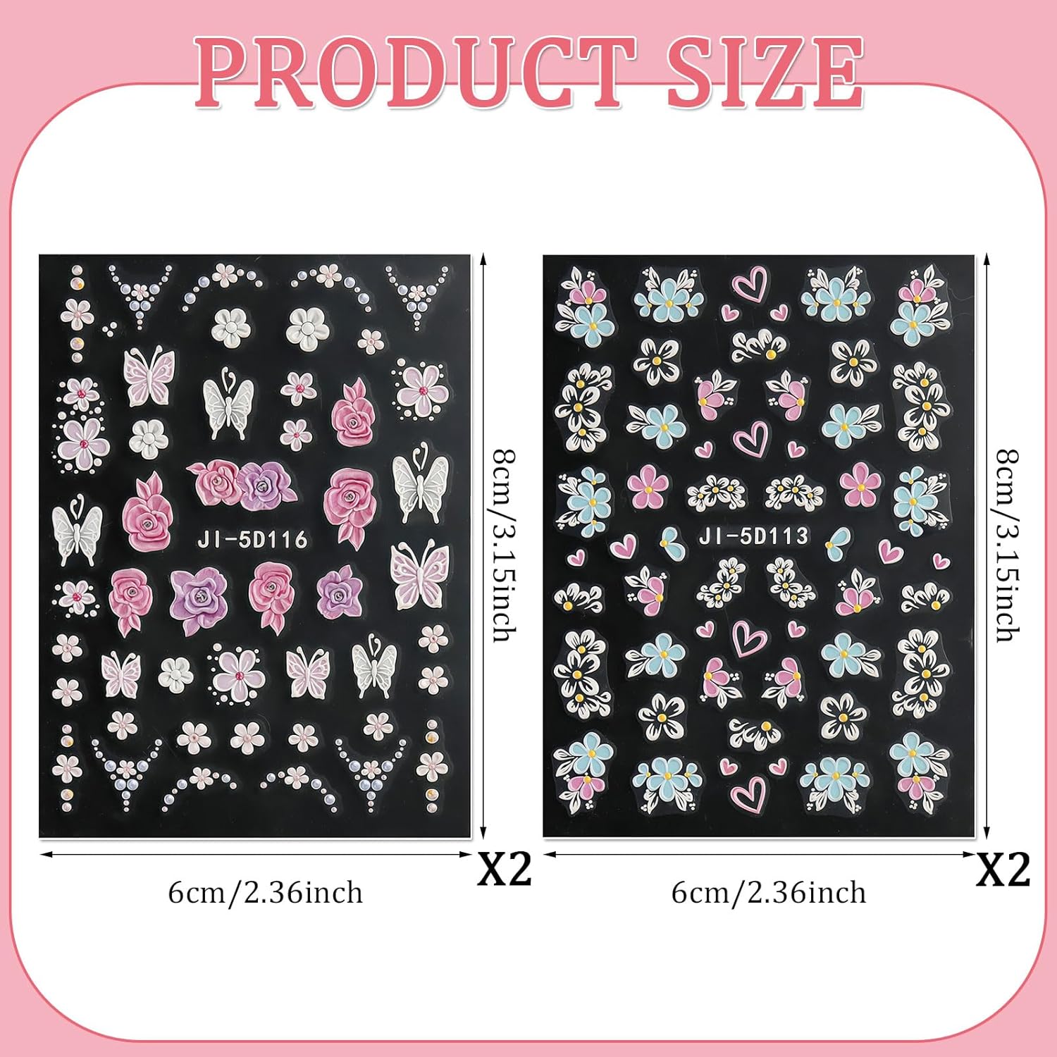 - ăFlower Nail Stickers SetăYou will get 4 sheets 3d flower nail stickers for acrylic nails supply, many cute flower pattern for you to choose, colorful floral nail designs, and satisfy your rich imagination of nail DIY.