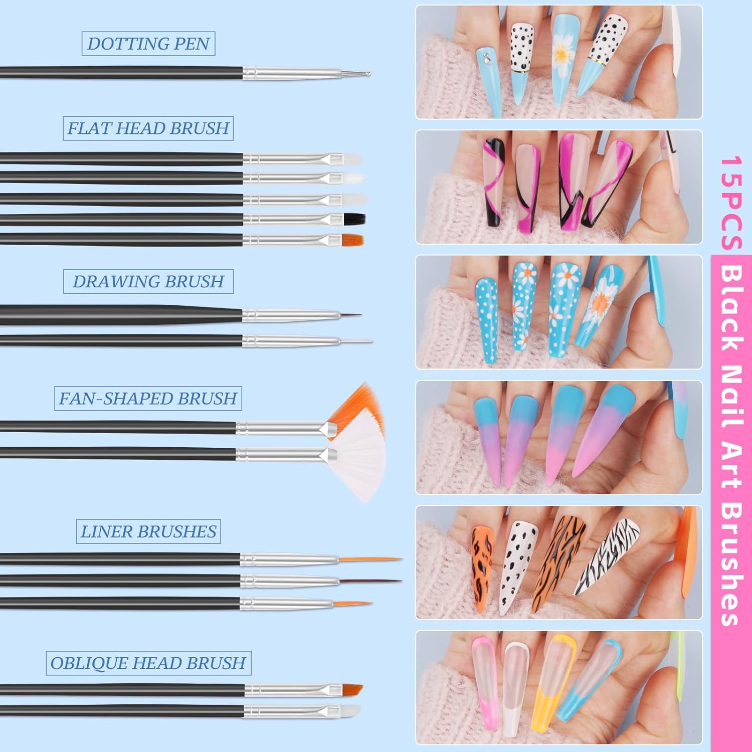 - Professional Nail Design Tools: This brush head is made of microfiber bristles, easily outline fine lines and gradient halo. The handle comes in ABS frosted material and designed to fit the curvature of the hand, suitable for novice practice and professional level coloring. It also includes popular brush types such as gel nail brush, liner brush, drawing pen brush and so on, which can easily cope with the needs of all scenarios such as building up, applying rhinestones, French edges, unlocking DIY nail design in one box.