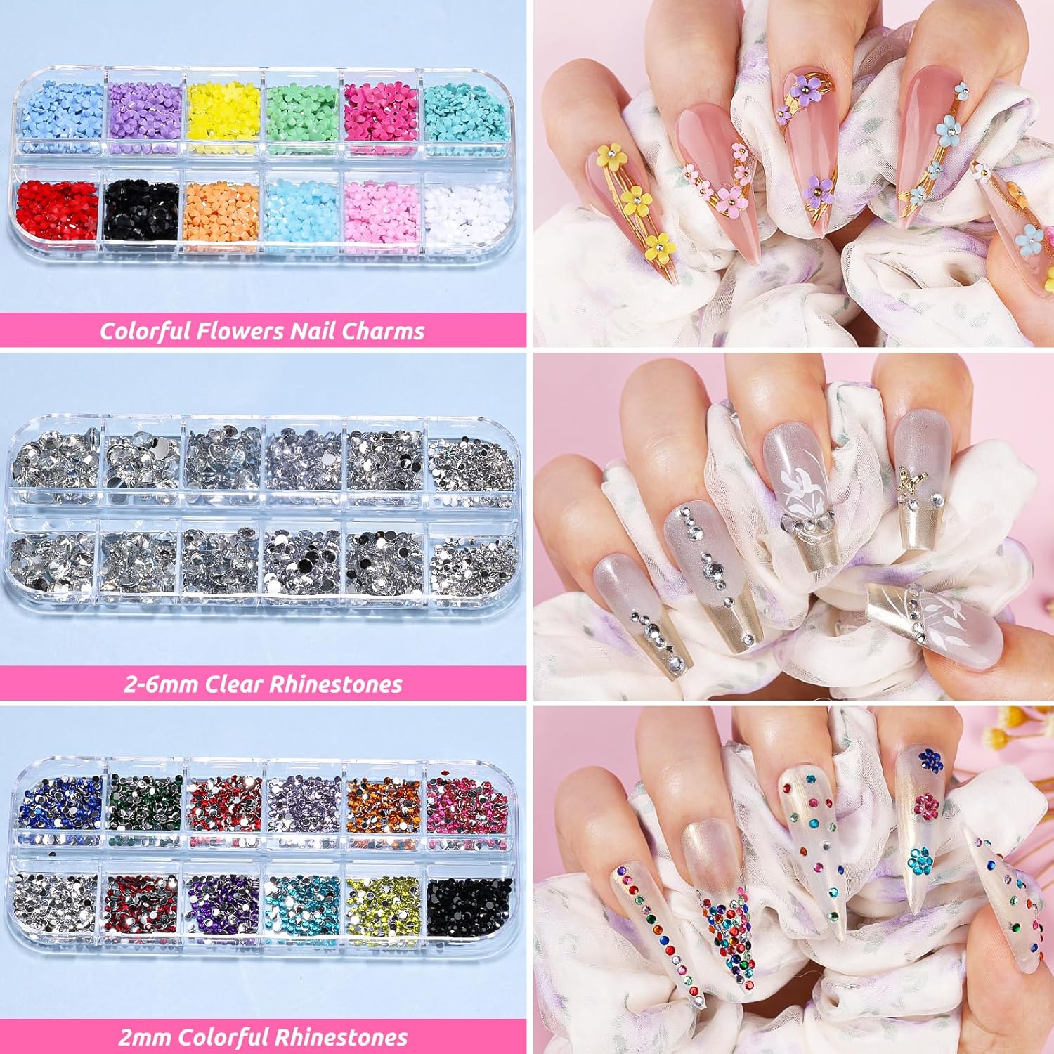 - Value Nail Art Set: 3D flatback rhinestones, holographic glitter flakes, delicate acrylic flower nail charms caviar beads, punk metal studs and vintage foils - all in one kit, perfect for beginners craving salon-quality results or time-saving professionals looking to create a nail look exclusively for you.