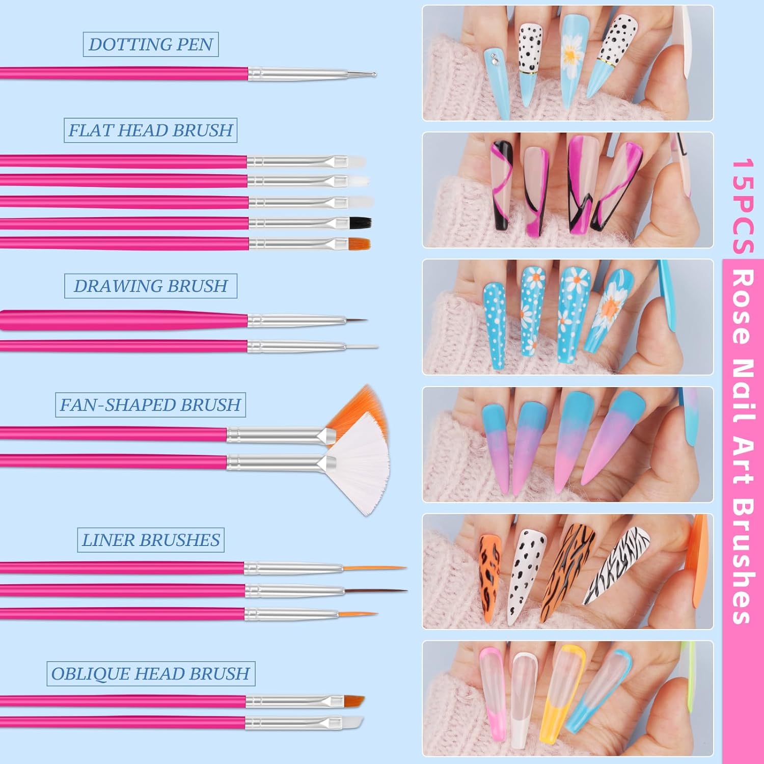 - Professional Nail Design Tools: This brush head is made of microfiber bristles, easily outline fine lines and gradient halo. The handle comes in ABS frosted material and designed to fit the curvature of the hand, suitable for novice practice and professional level coloring. It also includes popular brush types such as gel nail brush, liner brush, drawing pen brush and so on, which can easily cope with the needs of all scenarios such as building up, applying rhinestones, French edges, unlocking DIY nail design in one box.