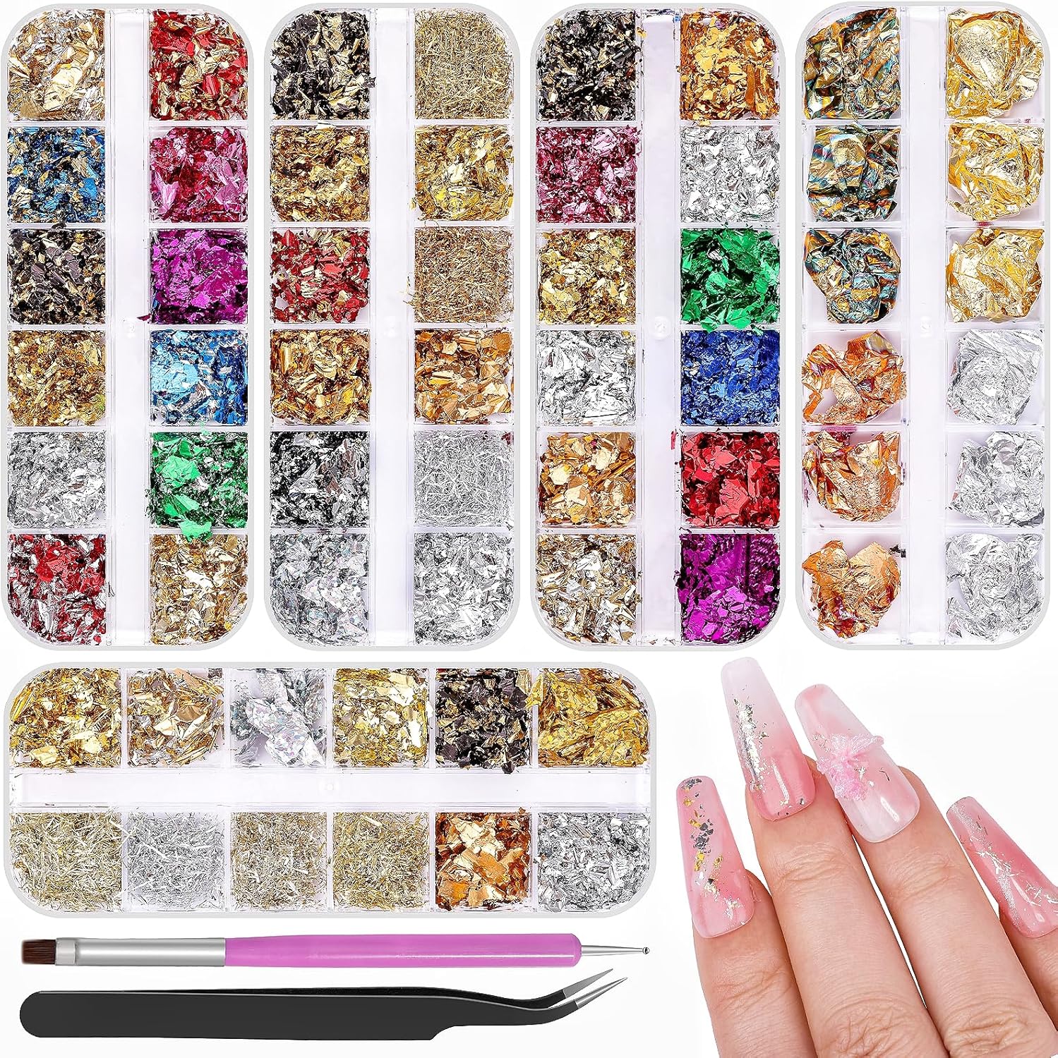 - Nail Glitter Flakes Kit: You'll get 5 boxes of nail foils, 1 pair of precision tweezers, and 1 cs of dual-end nail brush/dotting pen—everything you need for stunning nail art!